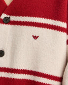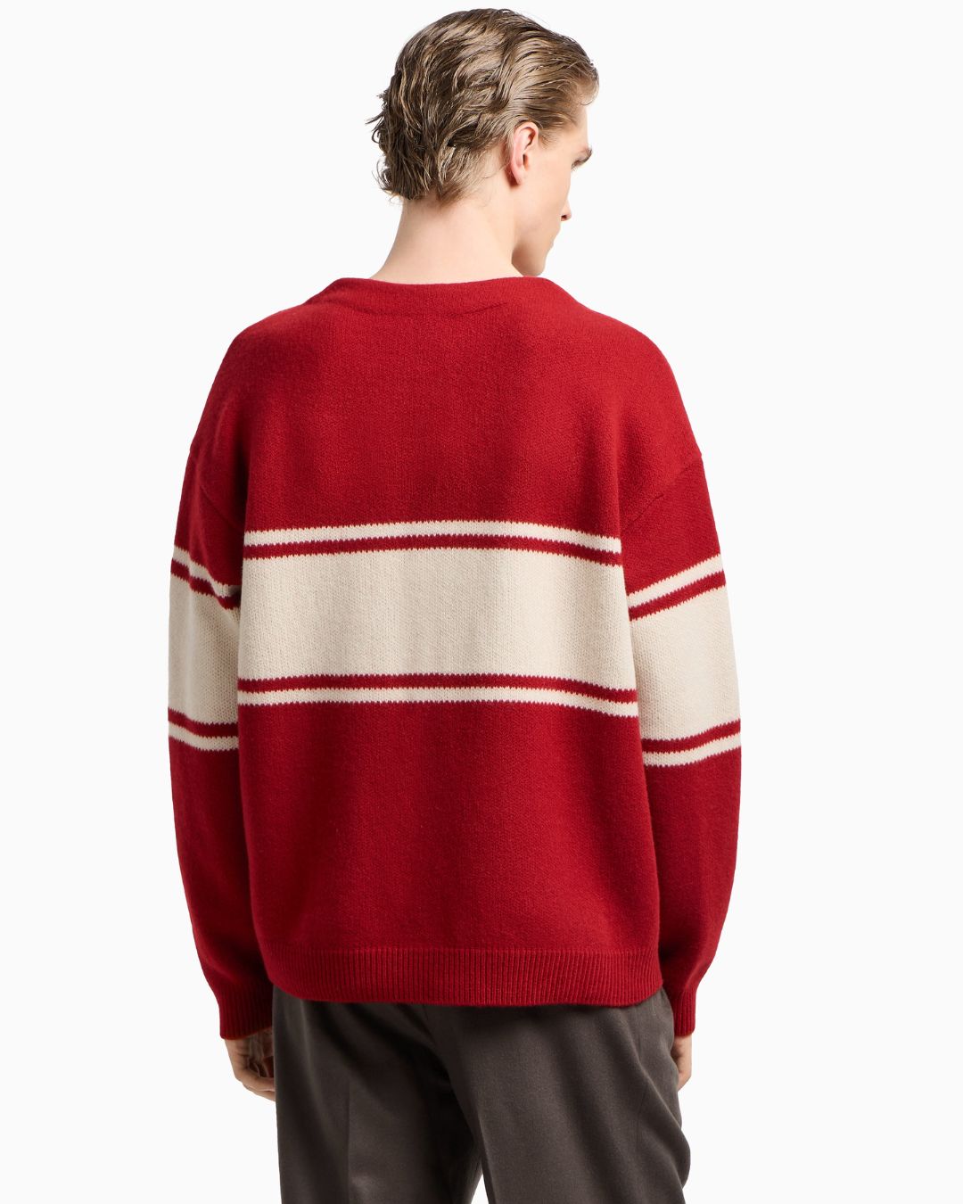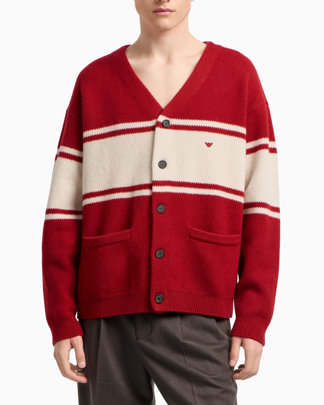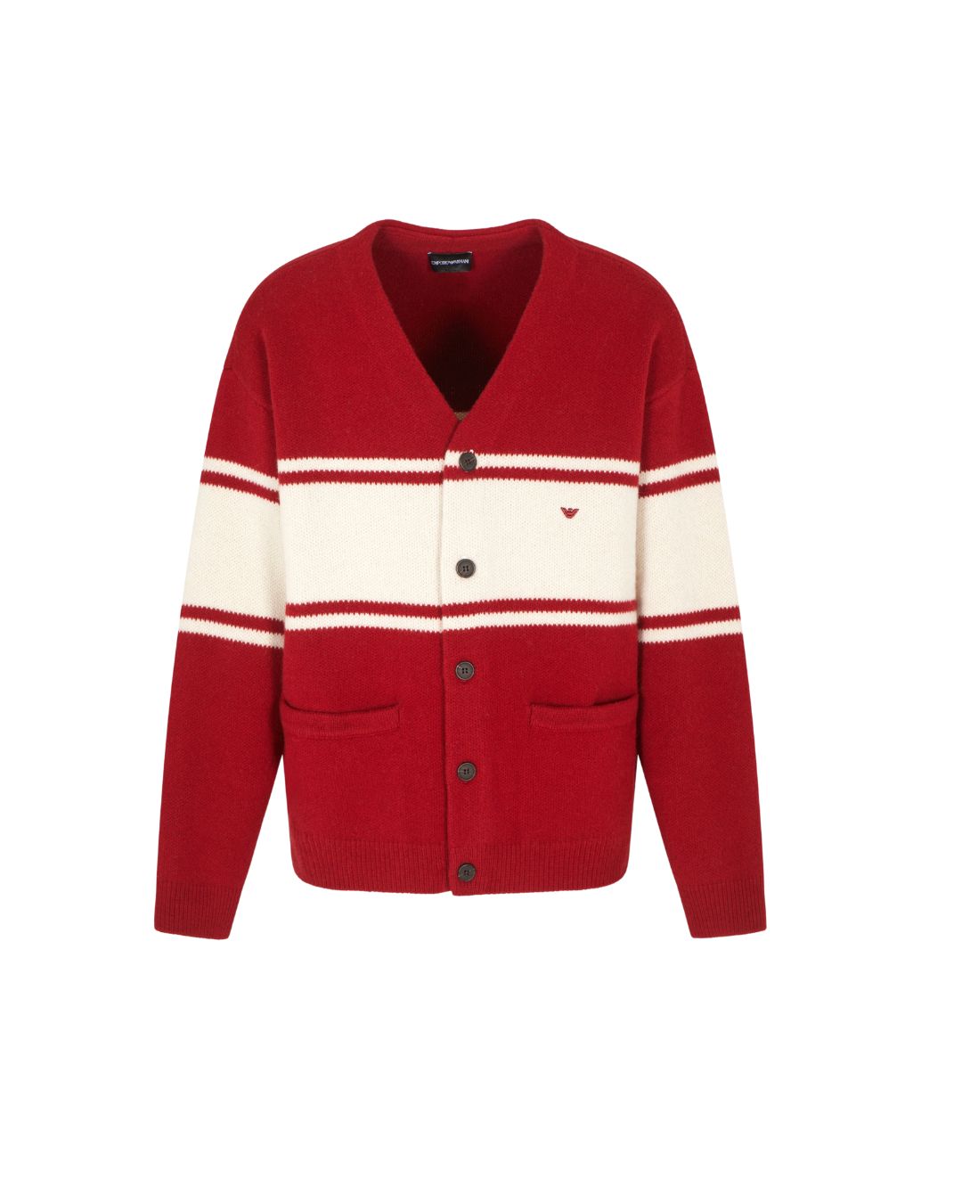 V-neck cardigan crafted from pure virgin wool in a plush, heavy knit for a cocooning feel. Featuring front button closure, a contrasting jacquard stripe, and an embroidered micro eagle on the chest for a distinctive finish.