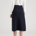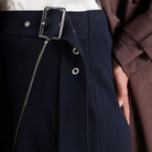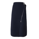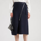 Elevate your wardrobe with this sleek and modern navy midi skirt, featuring a flattering wrap-style silhouette and an asymmetric front zip detail for a contemporary edge. Finished with a subtle buckle at the waist, it offers a structured yet feminine look—perfect for both office wear and polished off-duty styling.
