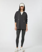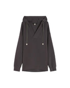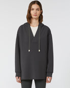 This oversized scuba jersey sweatshirt features a drawstring hood with branded WKND ribbons, a crossover V-neckline, and low set-in sleeves. Wide side slits and a butterfly logo at the hem add a bold, modern touch.