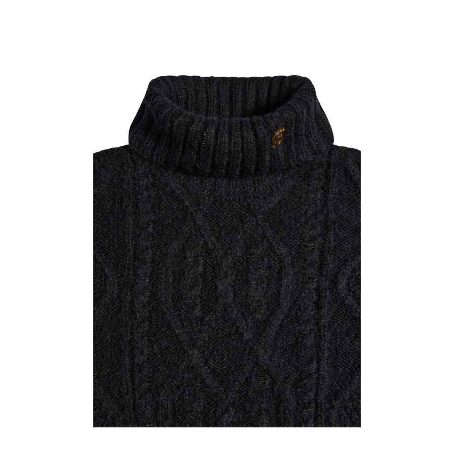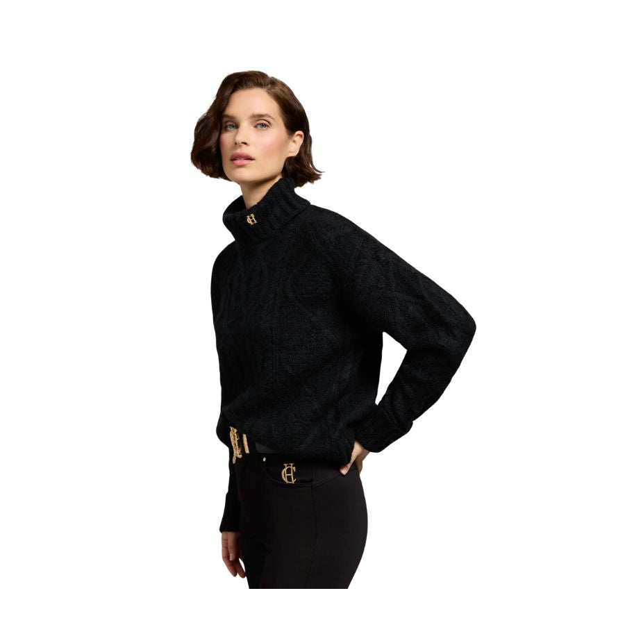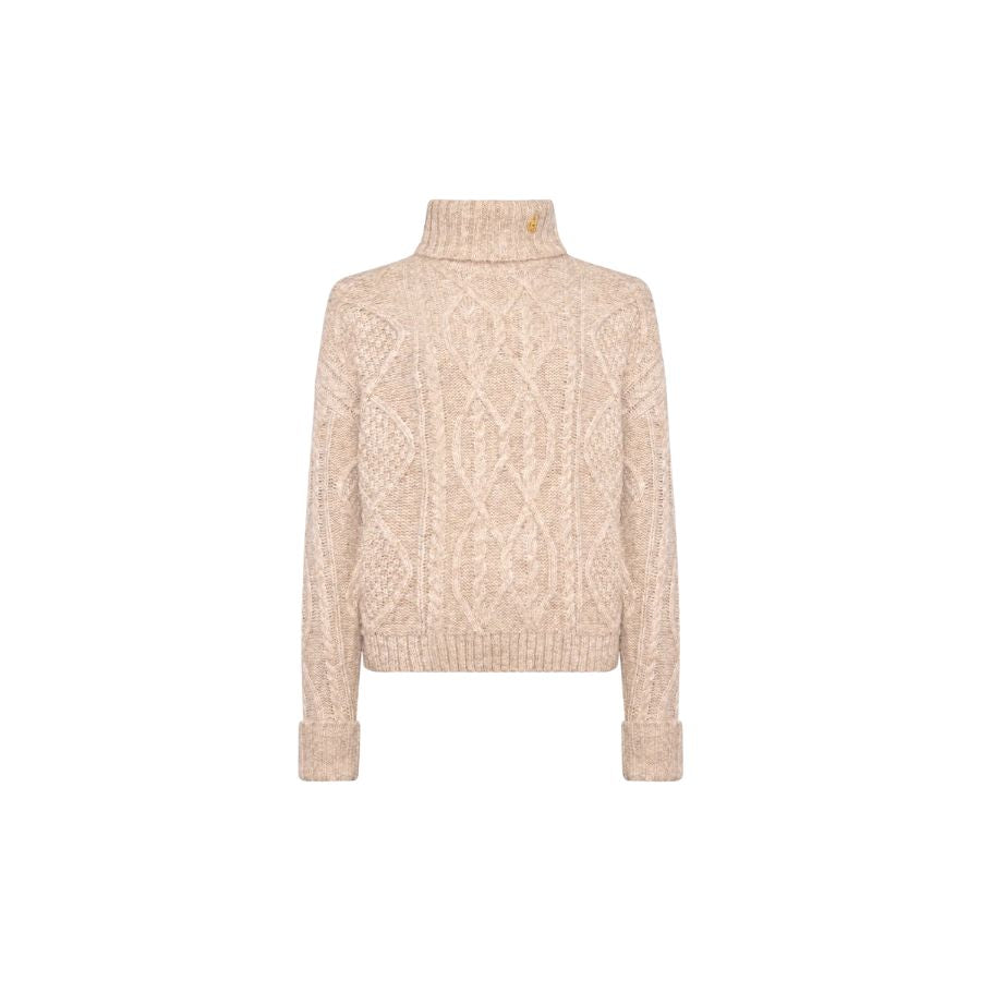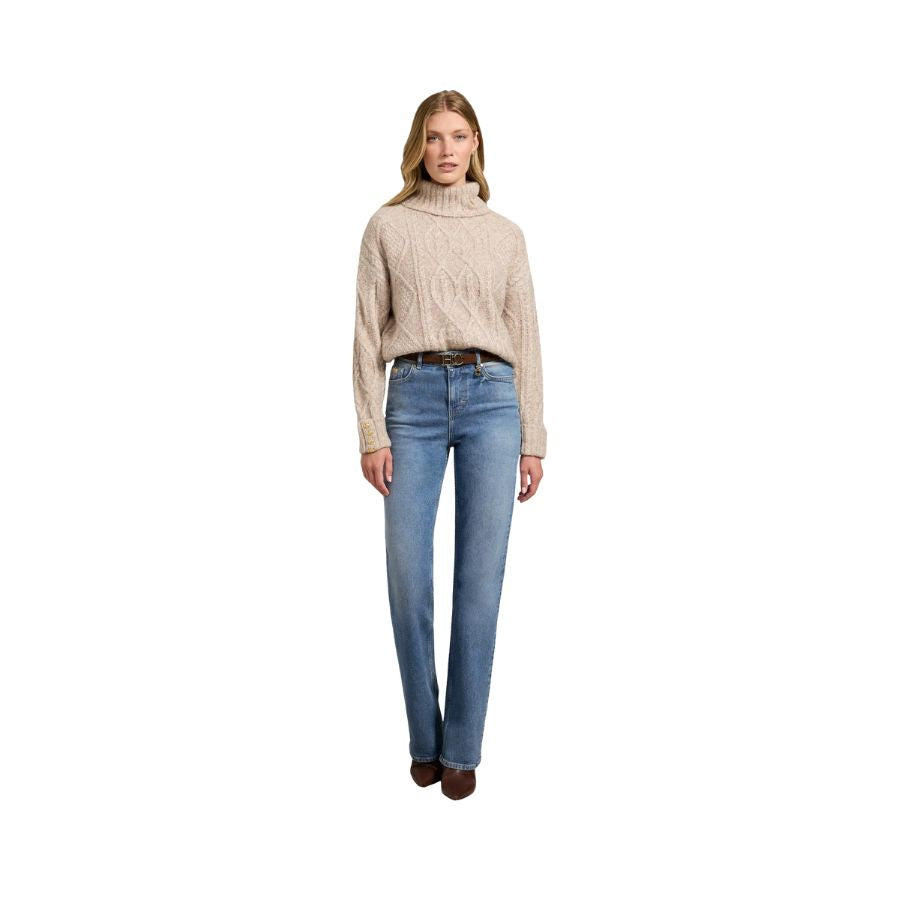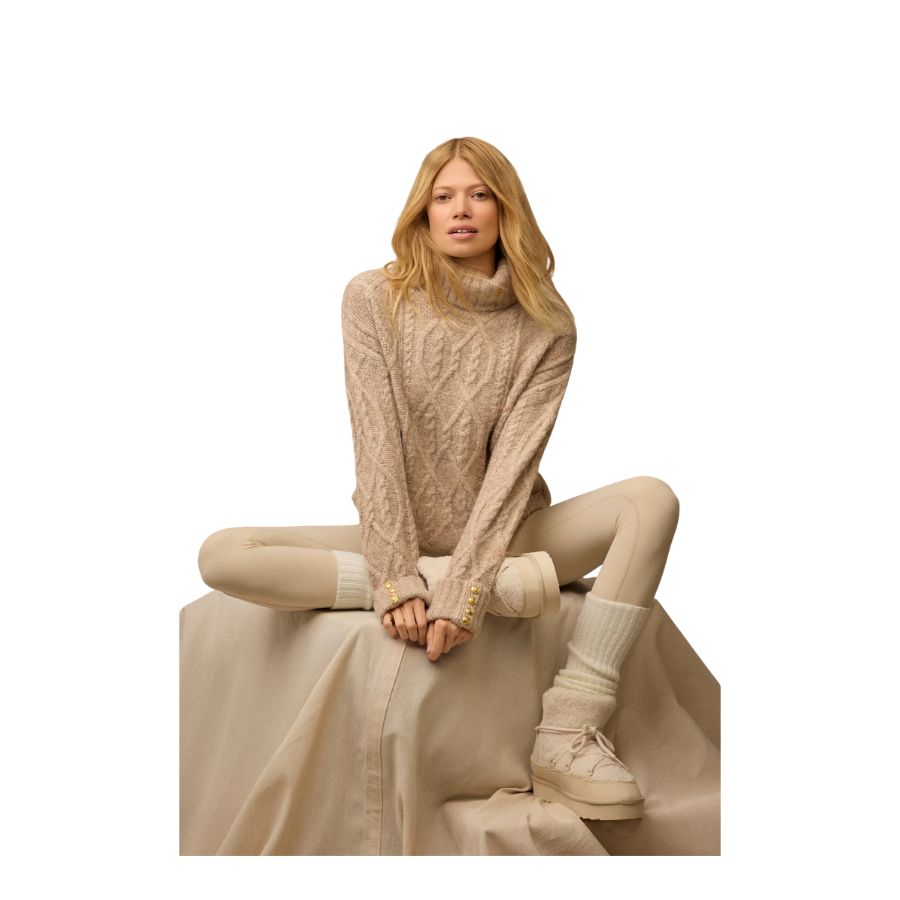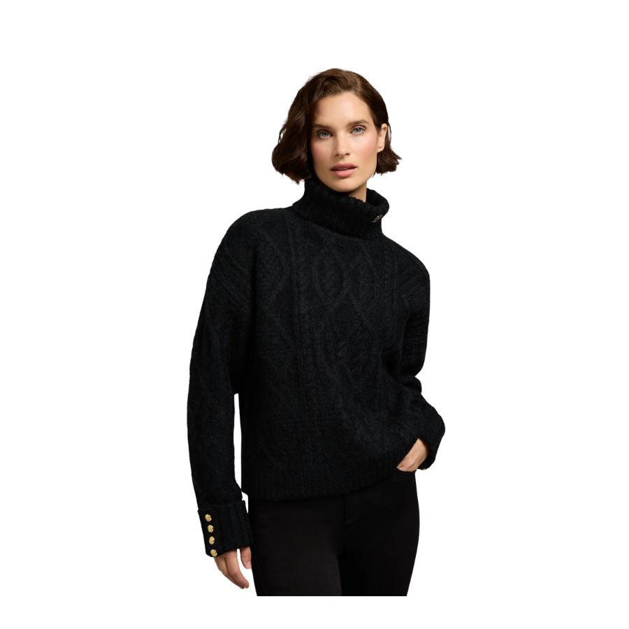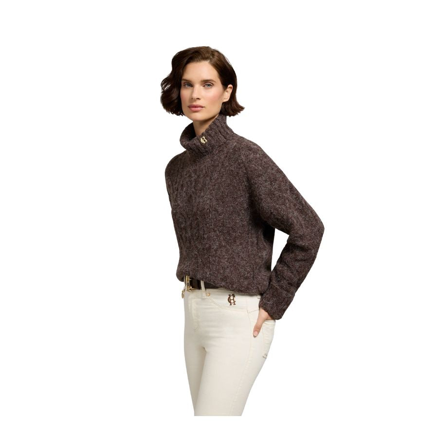 This Holland Cooper Roll Neck Knit is crafted from luxuriously soft yarn with subtle multi-tonal hues, this womens roll neck knit showcases a striking cable design that adds contemporary texture and visual interest. The boxy silhouette and drop shoulders deliver an effortlessly modern aesthetic, while signature gold rivets adorning the cuffs and refined Holland Cooper hardware at the collar provide sophisticated finishing details. A versatile wardrobe essential that elevates your seasonal knitwear with understated elegance and refined craftsmanship.