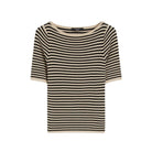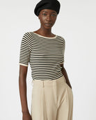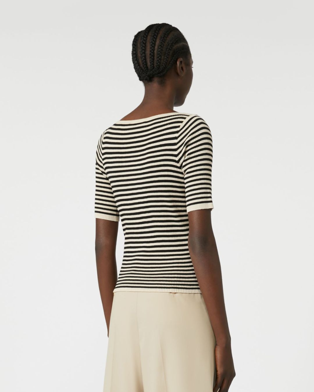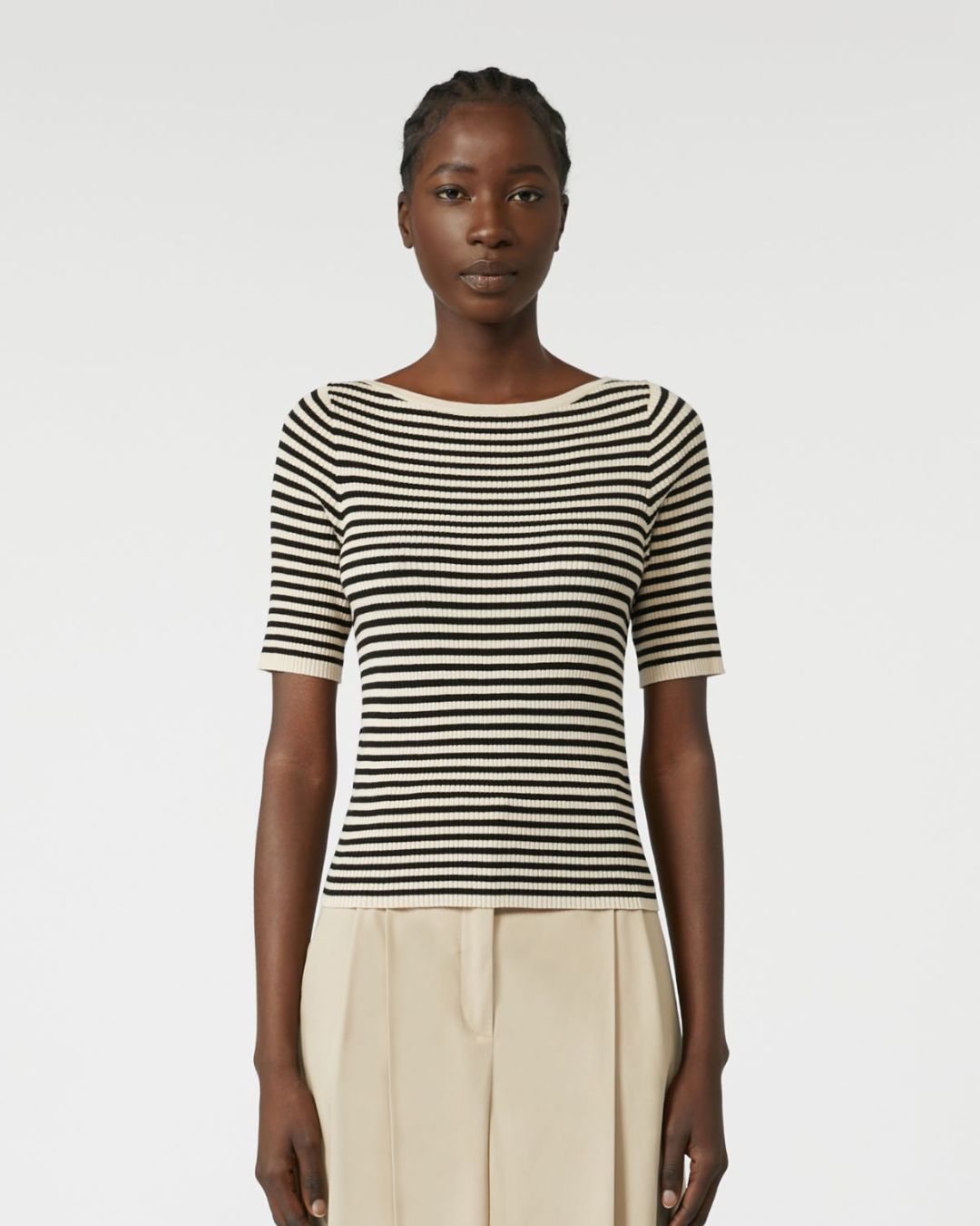 Crafted from stretch viscose yarn, this T-shirt features a rib-knit pattern that gently accentuates the feminine silhouette. Designed with a slim fit, it’s styled with a flattering boat neckline, short set-in sleeves, and a regular length for effortless everyday elegance.