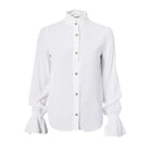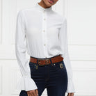 An elegant update to our Lilibet Tee, the Lilibet Shirt features delicate ruffles along the collar. With a relaxed fit, voluminous long sleeves, and elasticated cuffs for style and comfort. Crafted from tonal jacquard stripe fabric, adding versatility and timeless appeal to your collection.
