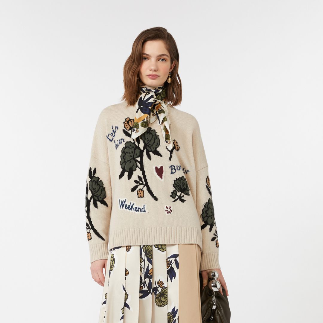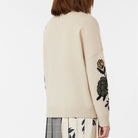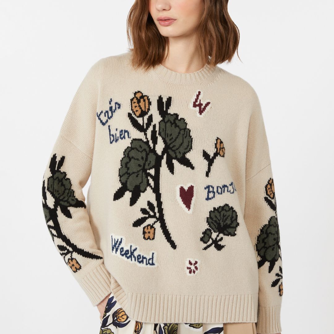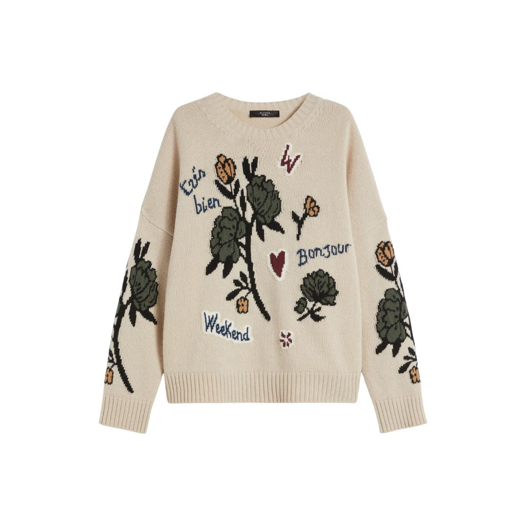This Women's oversized jumper is crafted from pure wool yarn and features an intarsia knit showcasing collection-inspired designs across the front and sleeves. Designed with a crew neck, long sleeves with dropped shoulders, and ribbed edges, it offers wide lines and a regular length for a relaxed yet refined silhouette.