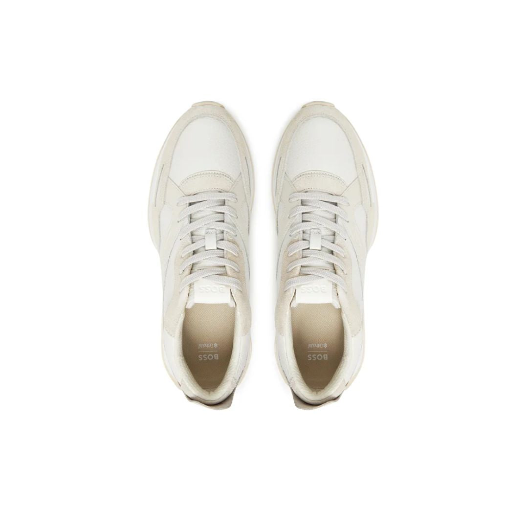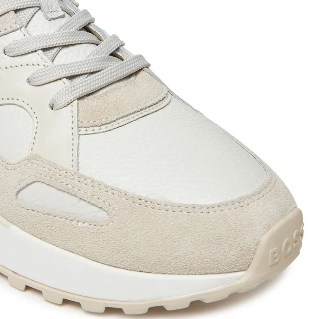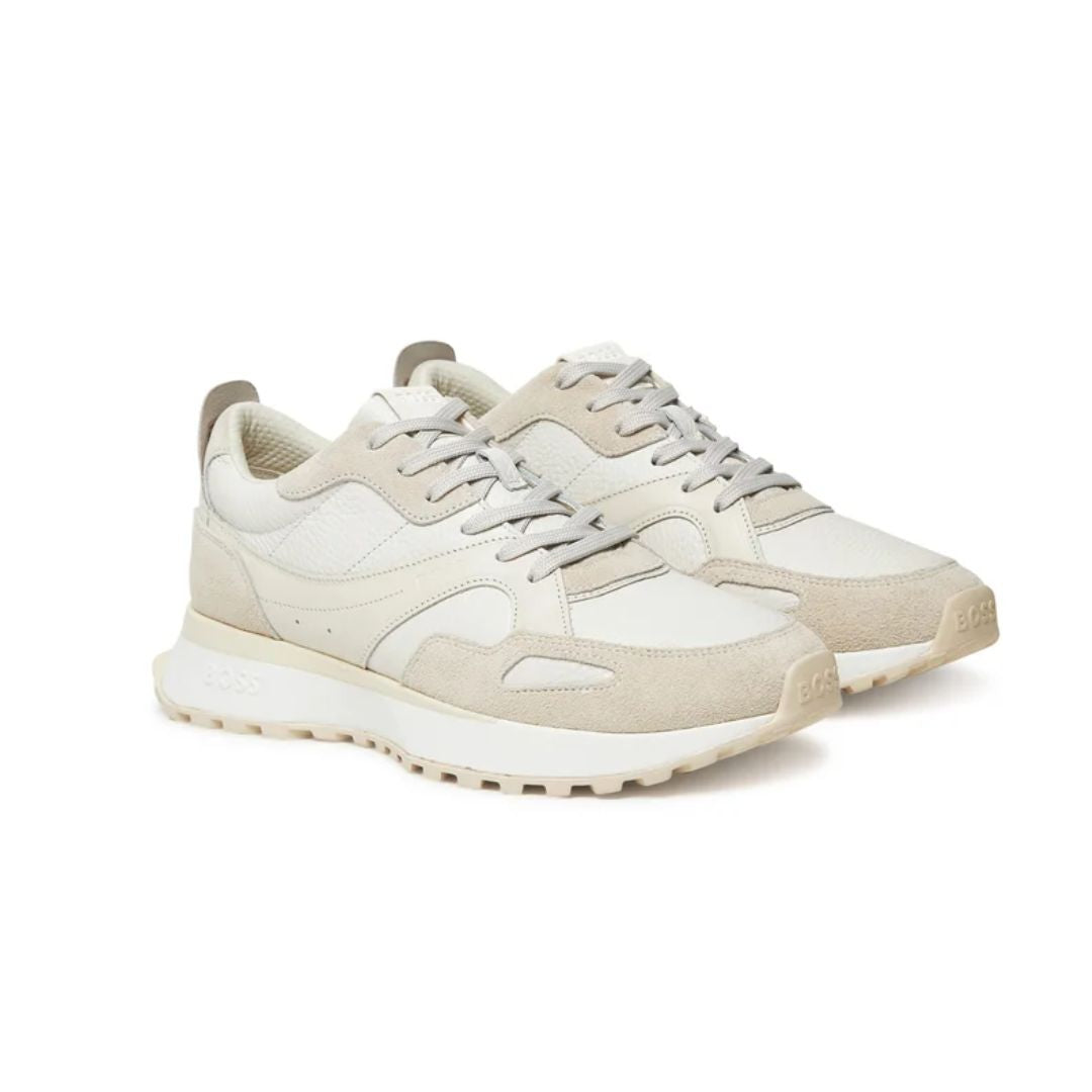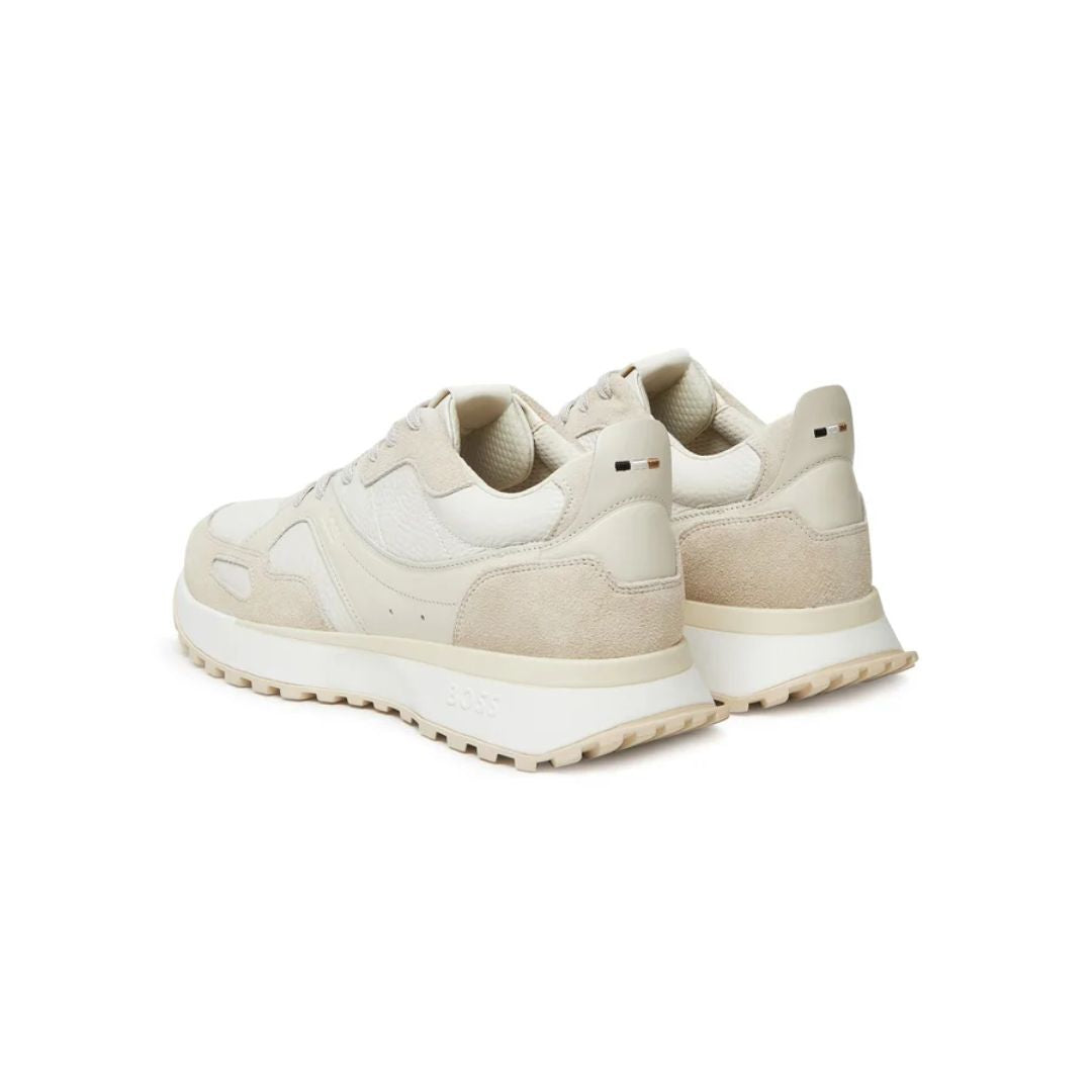 These BOSS men’s sneakers blend contemporary design with premium craftsmanship, making them a versatile choice for your casual footwear collection. Crafted from a mix of smooth leather, soft suede, and breathable mesh, they feature a layered panel construction in tonal shades for a clean, modern look. The lightweight EVA sole offers exceptional comfort and cushioning, while the durable rubber tread ensures reliable grip. Finished with subtle BOSS branding on the heel tab and sole, these sneakers pair effortlessly with jeans, chinos, or tailored joggers for a refined yet relaxed style.