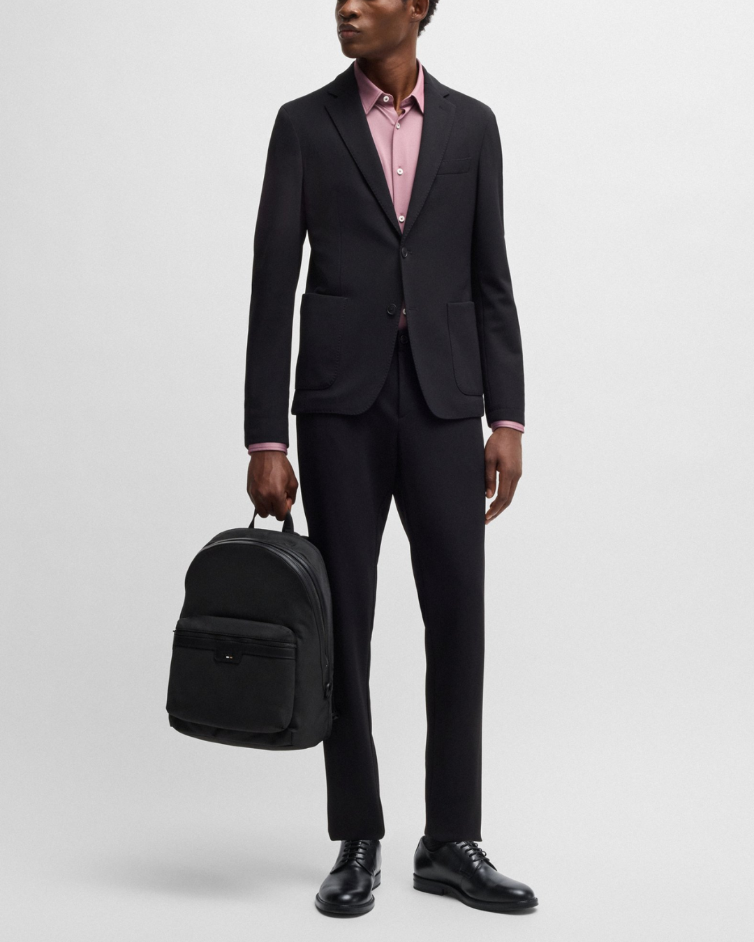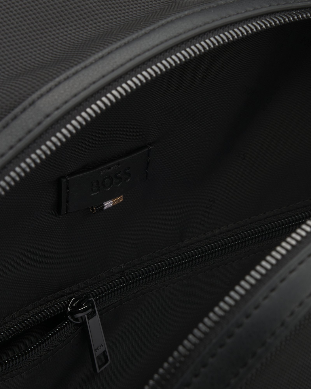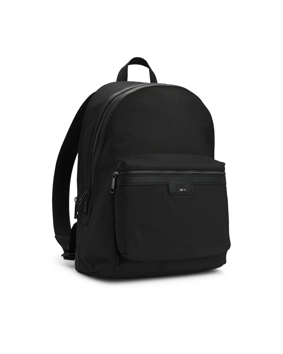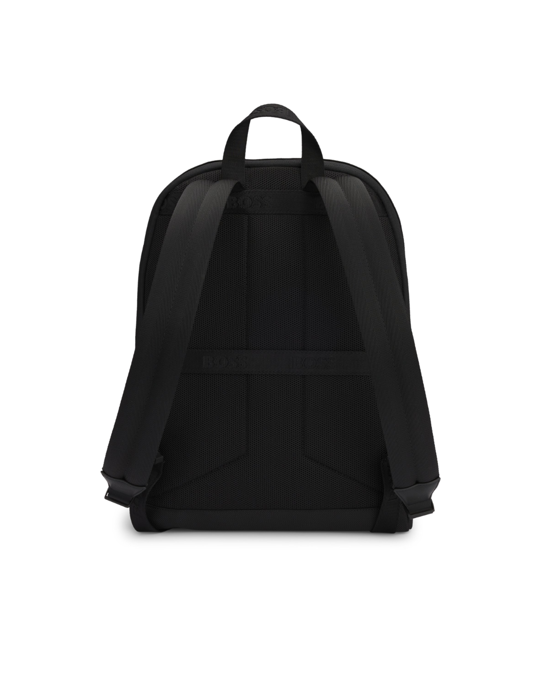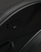 A minimalist backpack by BOSS Menswear, crafted from structured material for lasting durability. It features signature branding and a smart sleeve at the back for added functionality. This item is partially made with polyester.