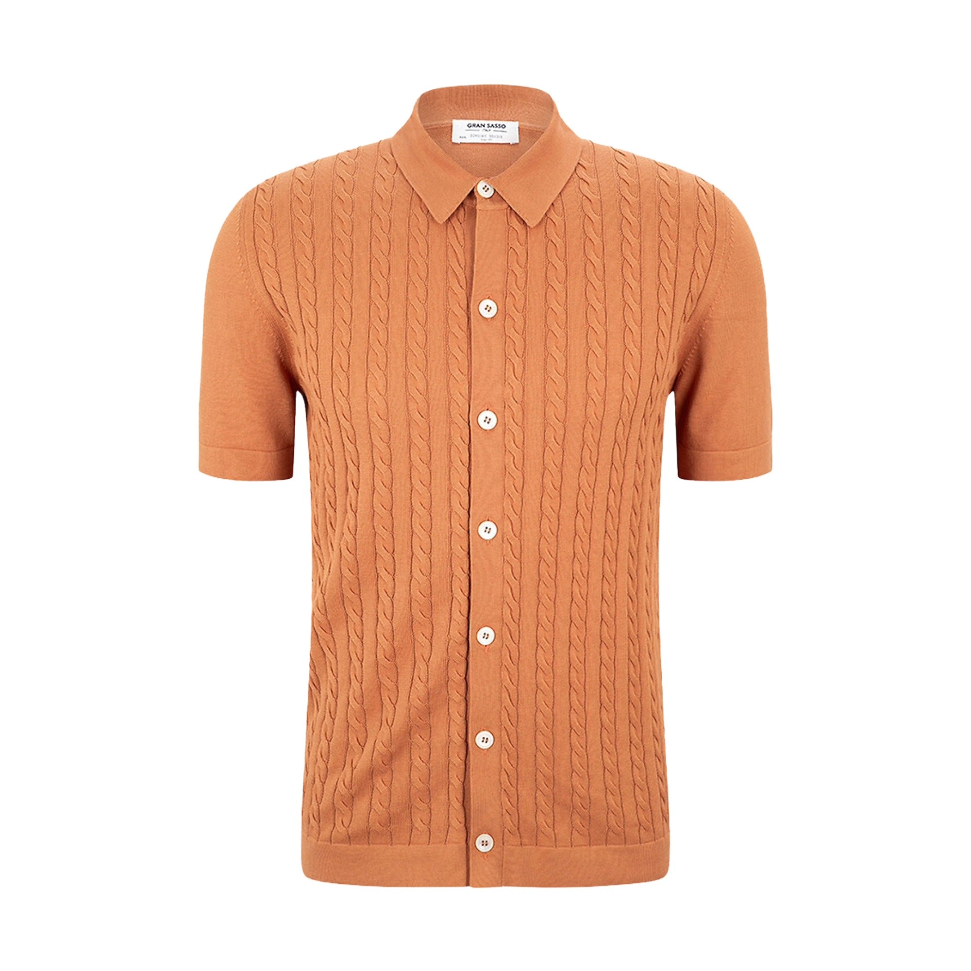 The Gran Sasso Cable Knit Men's Shirt offers a unique design, combining the knitted construction of a cardigan with the collar of a polo shirt, within a lightweight full button up shirt. This men's designer shirt is complete with short sleeves and is a distinctive choice for warm summer evenings.
