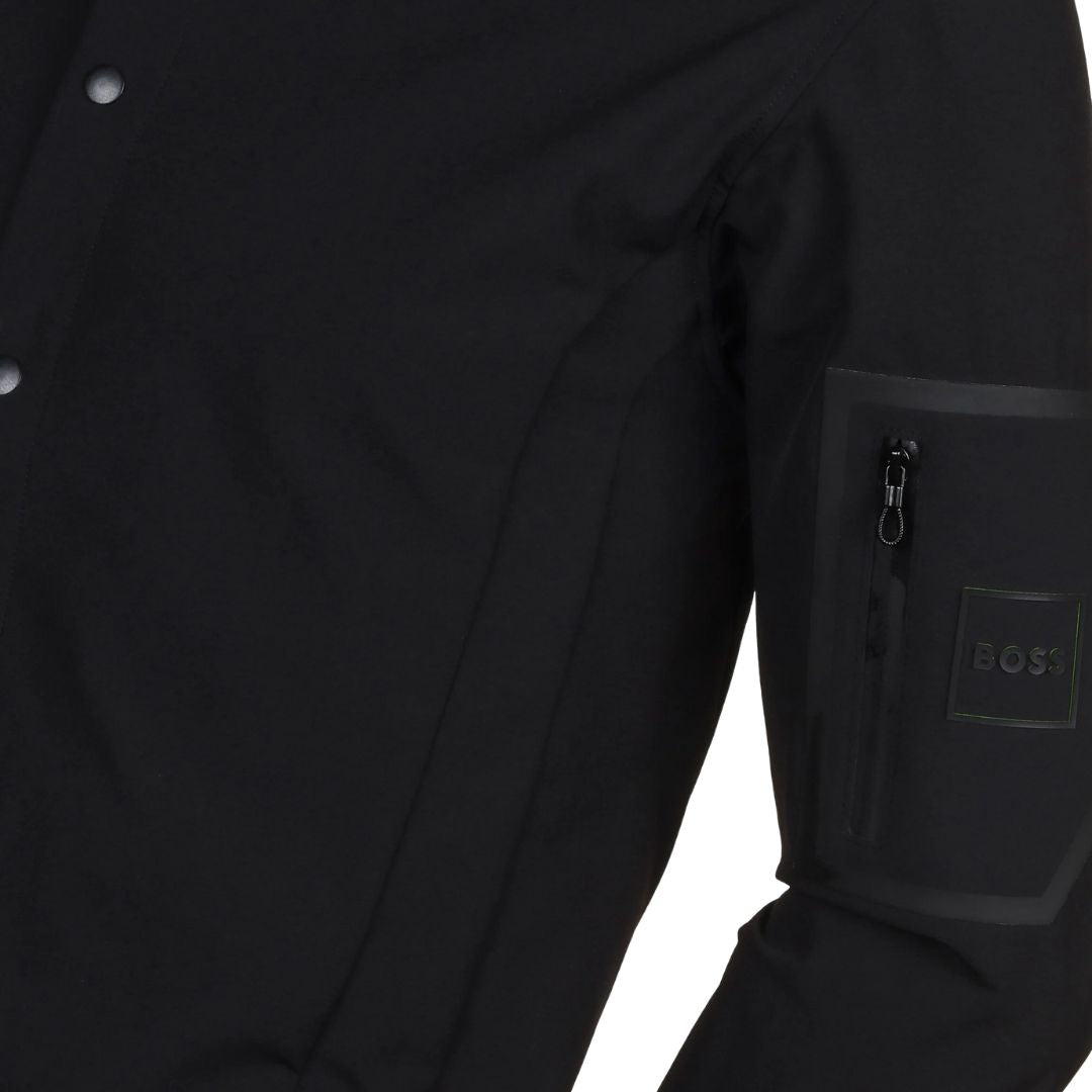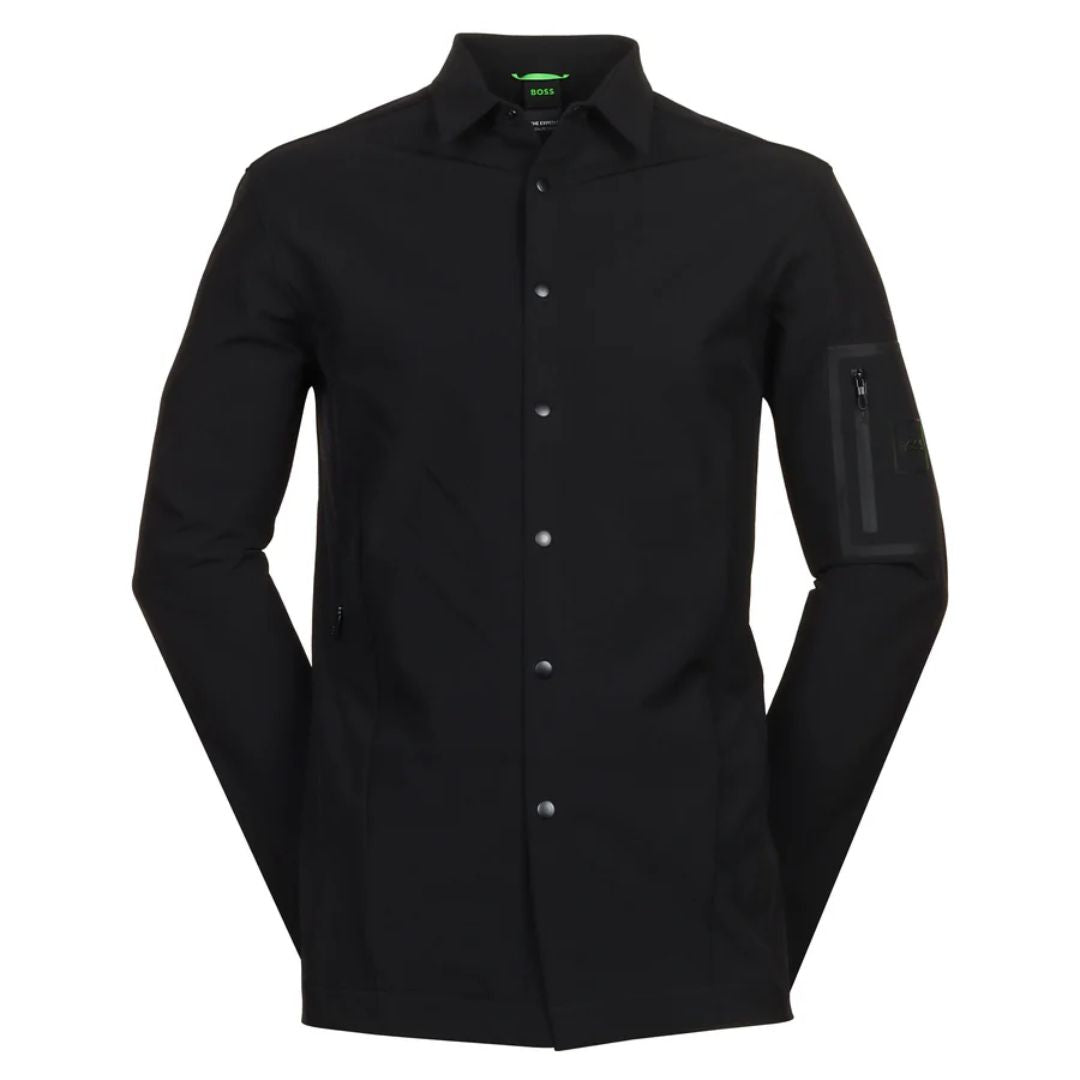 The BOSS Expedit L Overshirt offers a relaxed stretch fit and is made from water-resistant, quick-dry fabric. This men's shirt features a full press stud front, standard collar, press stud cuffs, and a zip pocket with a contrasting black BOSS logo on the upper left sleeve.