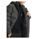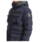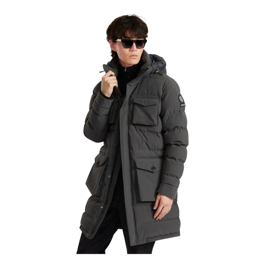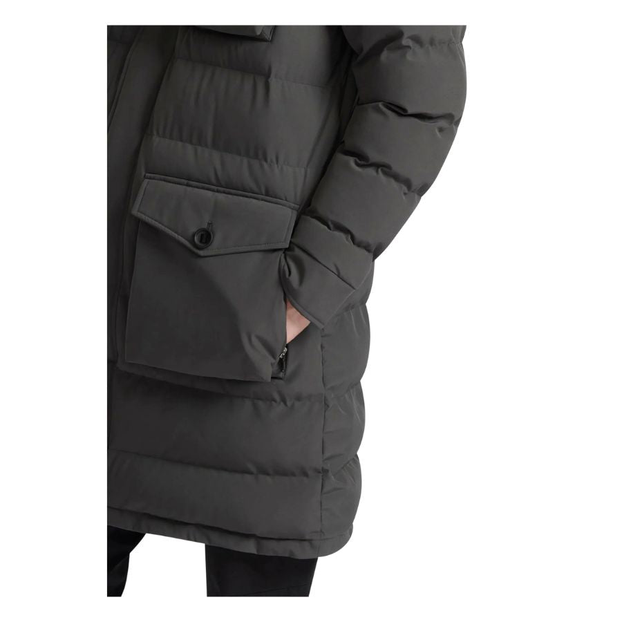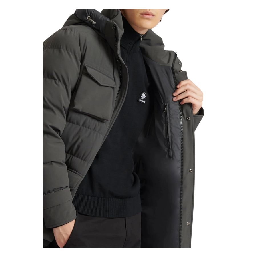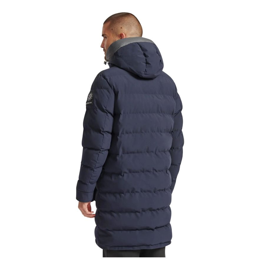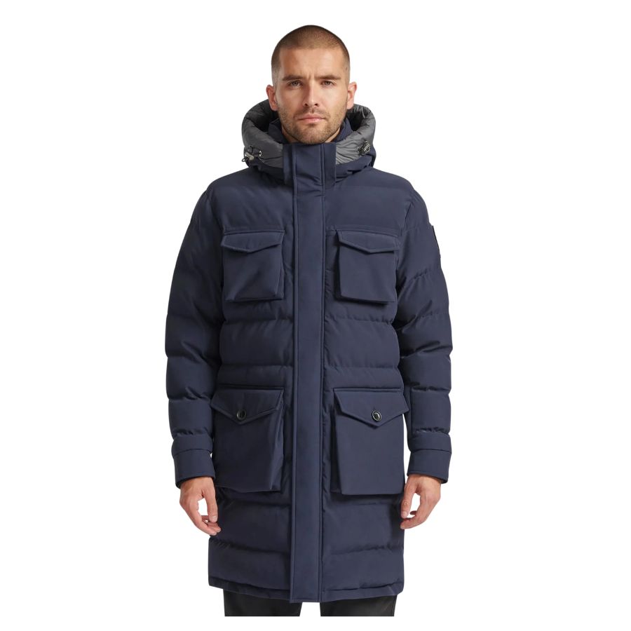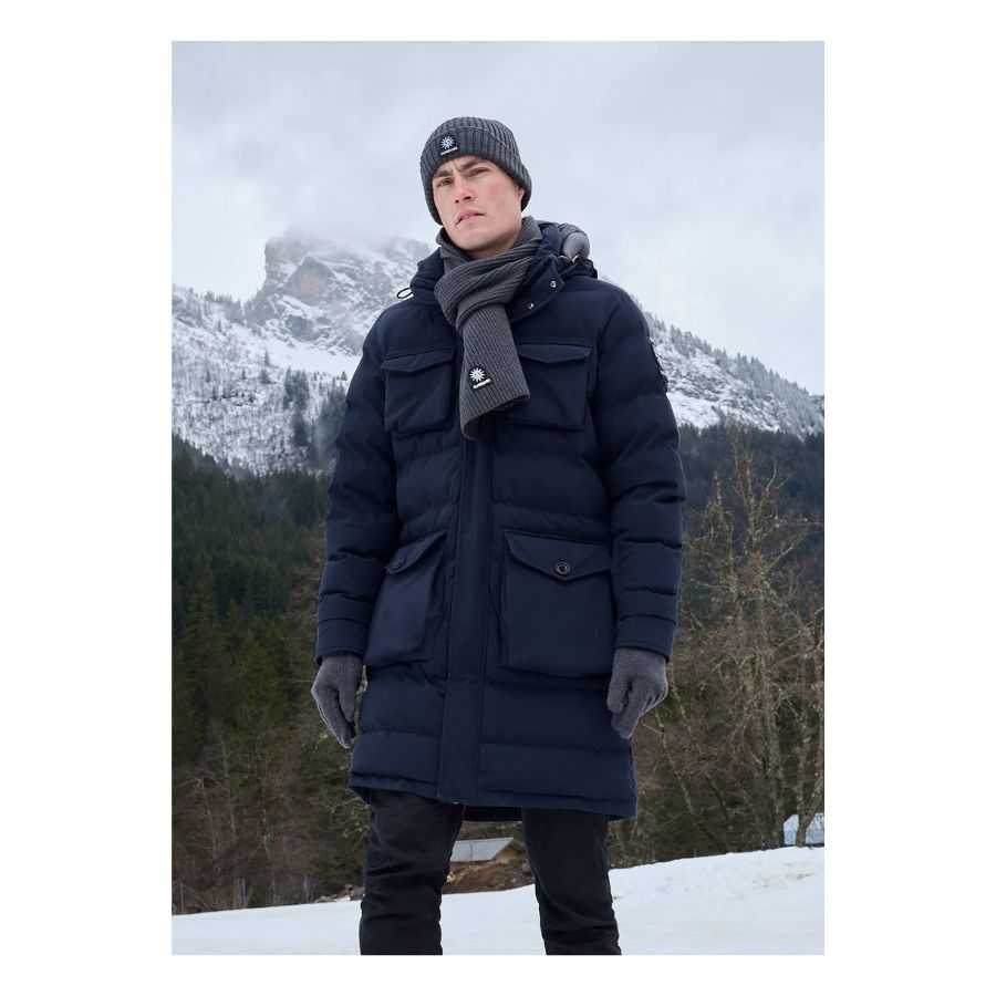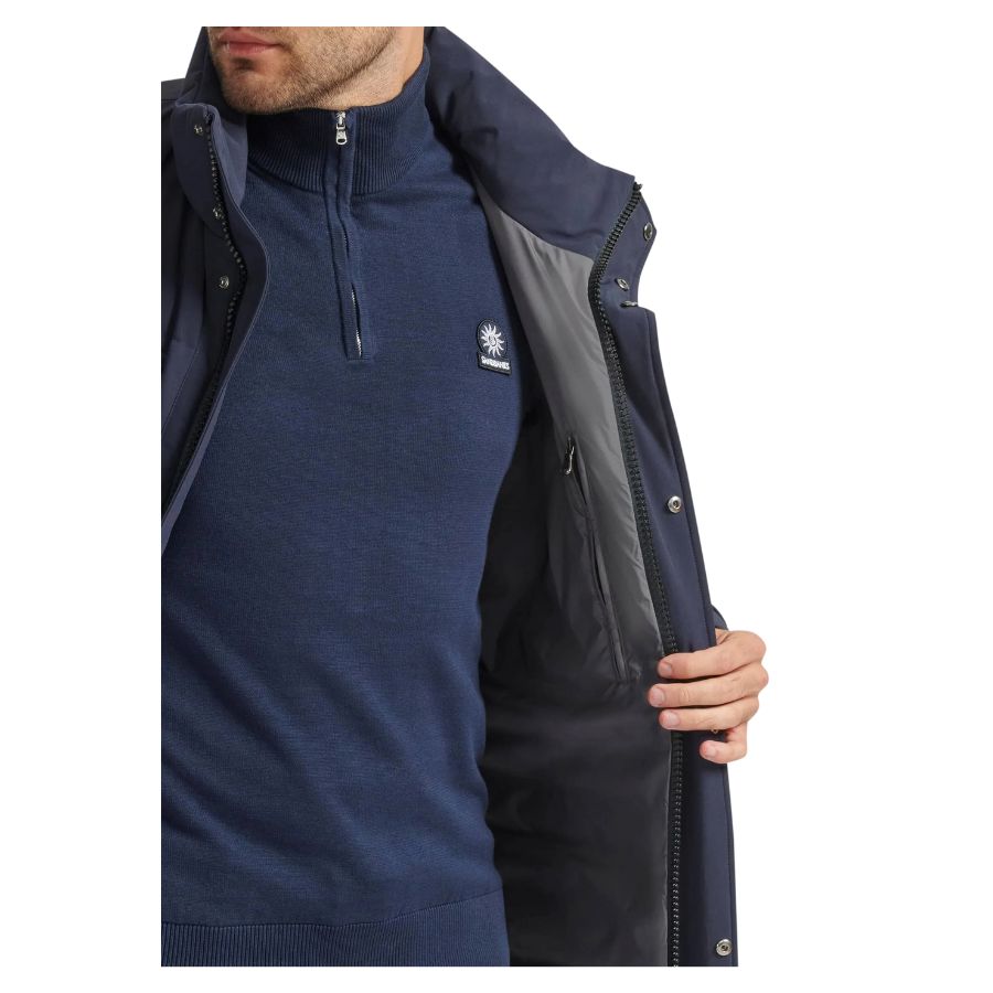 The Sandbanks Branksome Long Puffer Jacket, crafted primarily from recycled plastic bottles, combines sustainability with style. With high thermal retention, this long puffer features Sandbanks embroidered logo badges, large lower pocket/chest pocket details, and a detachable hood.