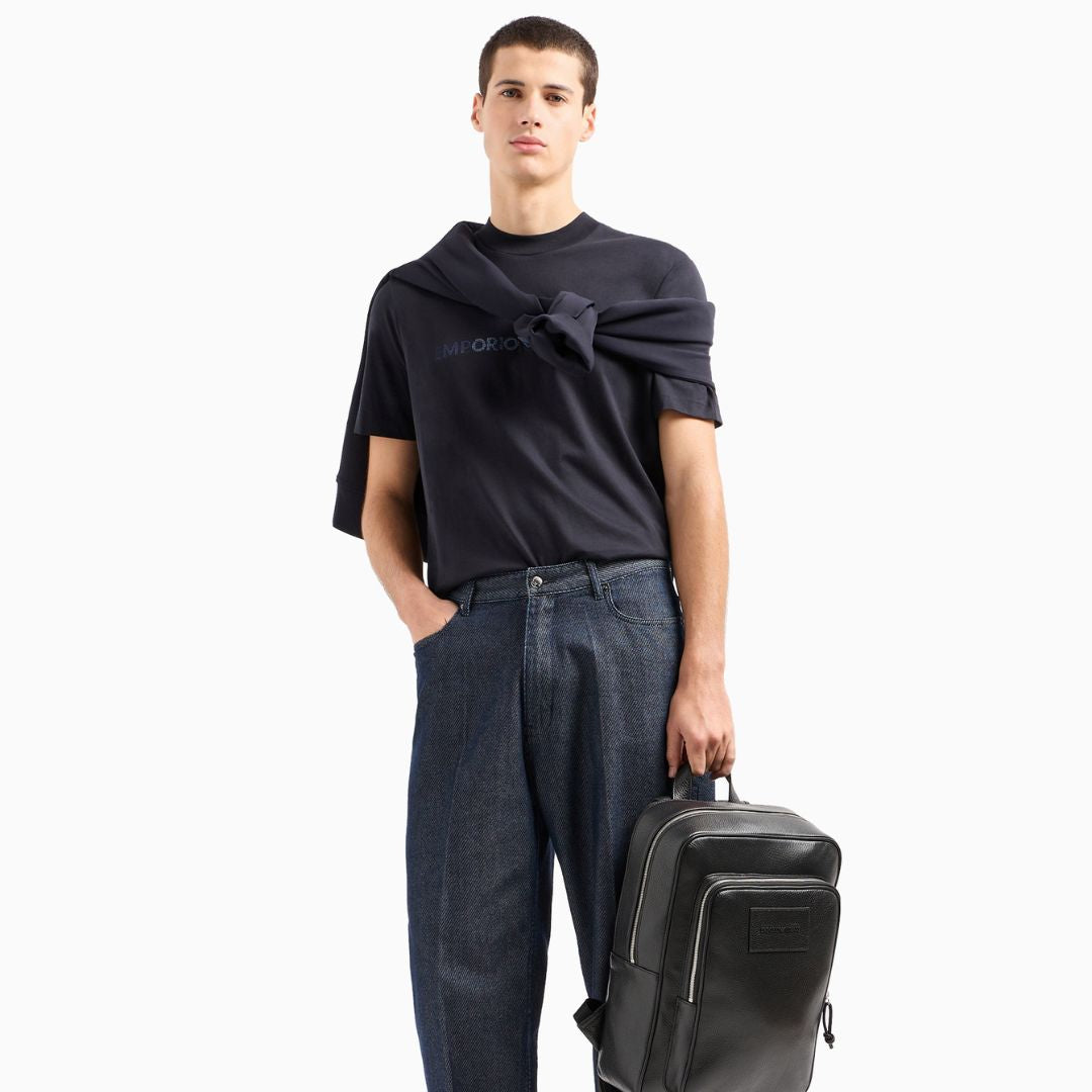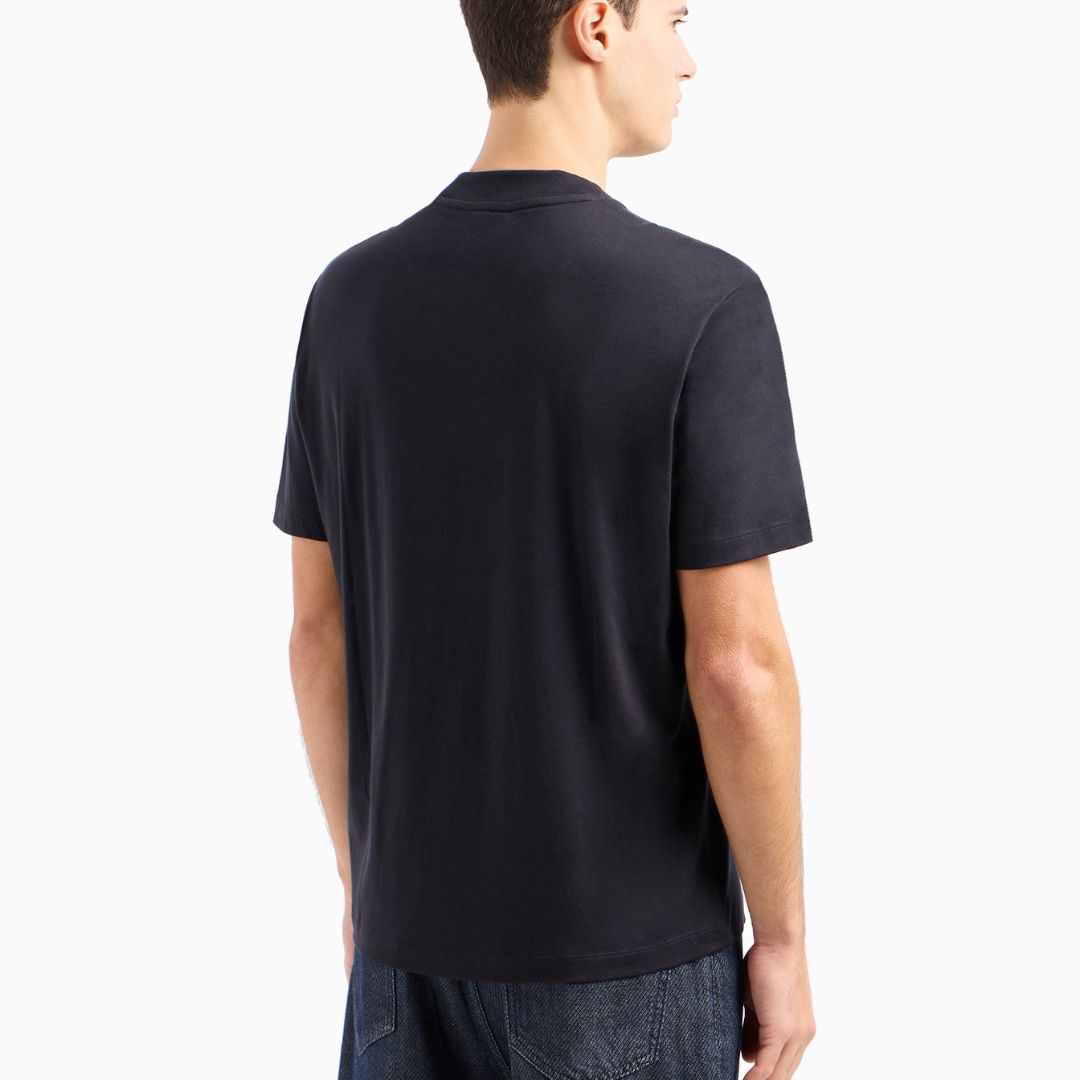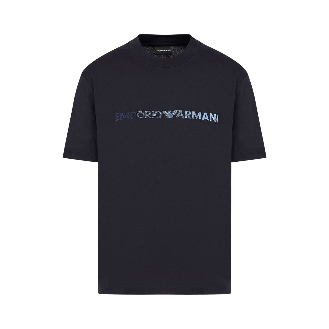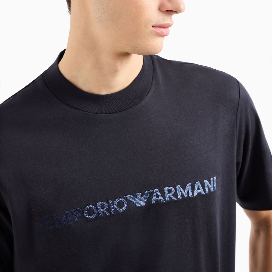 This Emporio Armani T-shirt is made from a premium blend of navy blue cotton and lyocell, offering a soft, breathable feel. It features an embroidered logo on the front with a gradient effect, adding a modern touch to the classic design. With a regular fit, this versatile t-shirt combines comfort and style, making it a timeless addition to any wardrobe.