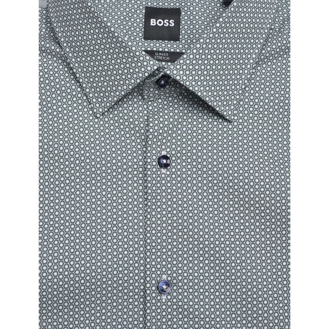 The BOSS H-HANK-kent-C1-214 Business Shirt features a cut-away collar with a shorter design and wider spacing between the tips, ideal for wide tie knots. It comes in a slim fit, tailored to closely follow the body's shape with a tapered waist and fitted arms, offering a sharp, contemporary look.