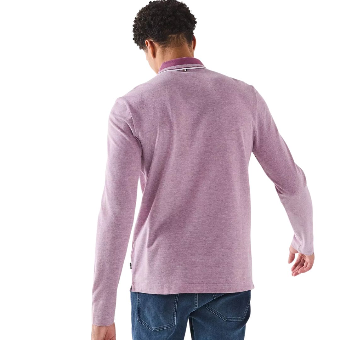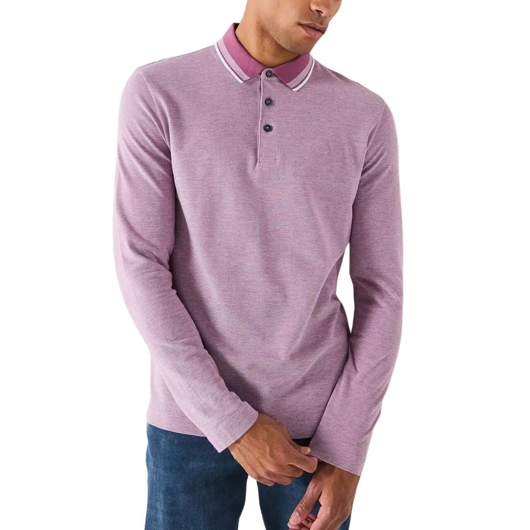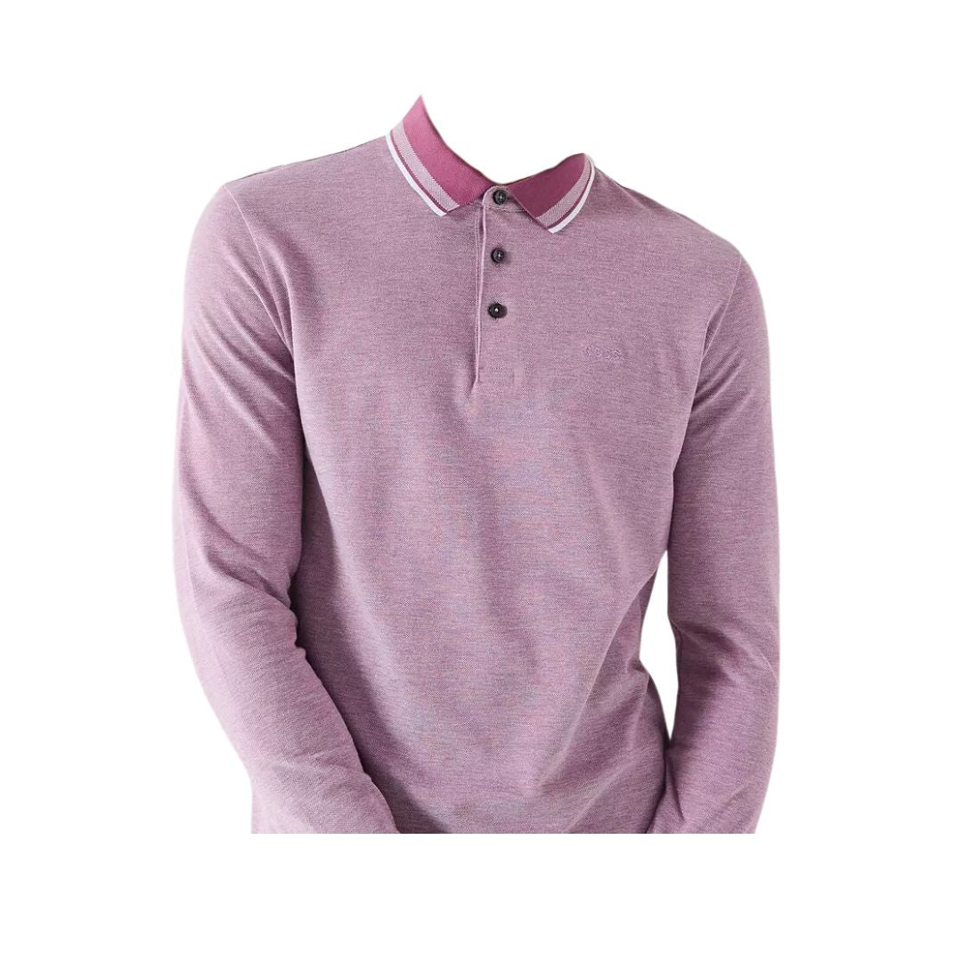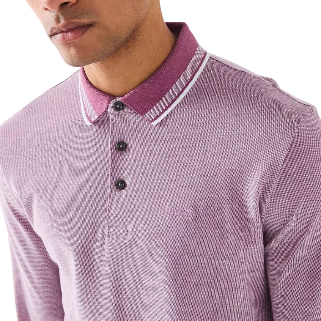 The H-Pittman 141 Regular Fit Tipping Logo Oxford Long Sleeve Polo Shirt by BOSS in purple features a stylish contrast tipping on the collar, adding a refined touch to the design. It has a button placket for a classic look and an embroidered logo on the chest for subtle branding. The soft polo collar and long sleeves enhance comfort and versatility, making it a perfect addition to both casual and smart-casual wardrobes.