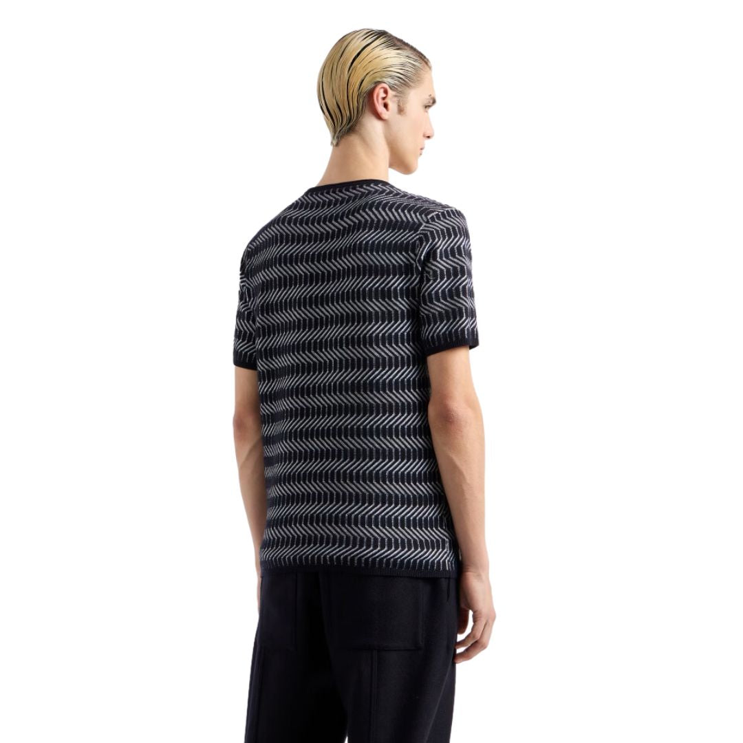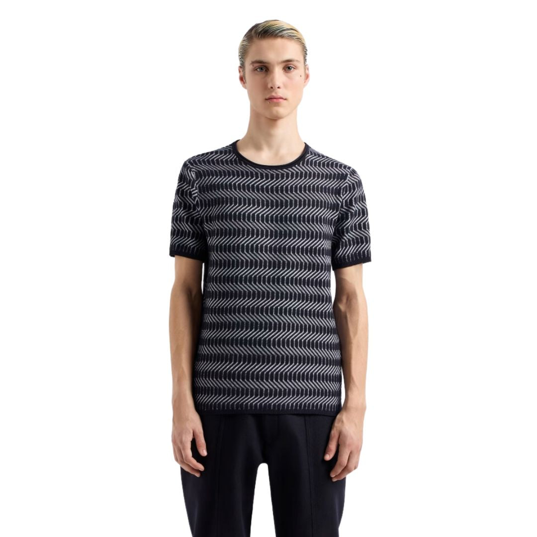 This short-sleeved crew-neck jumper, crafted from pure virgin wool, showcases an all-over two-tone op-art motif, making a bold statement in contemporary style. Part of Emporio Armani's exclusive Icon capsule collection for the AW24 season, this piece redefines classic knitwear with a modern twist. Designed for the Emporio Armani man, the collection revisits iconic shapes that are central to the brand's identity. With an emphasis on knitted textures, this collection embodies comfort and relaxed sophistication, offering complete winter looks that capture the essence of Emporio Armani's timeless style.