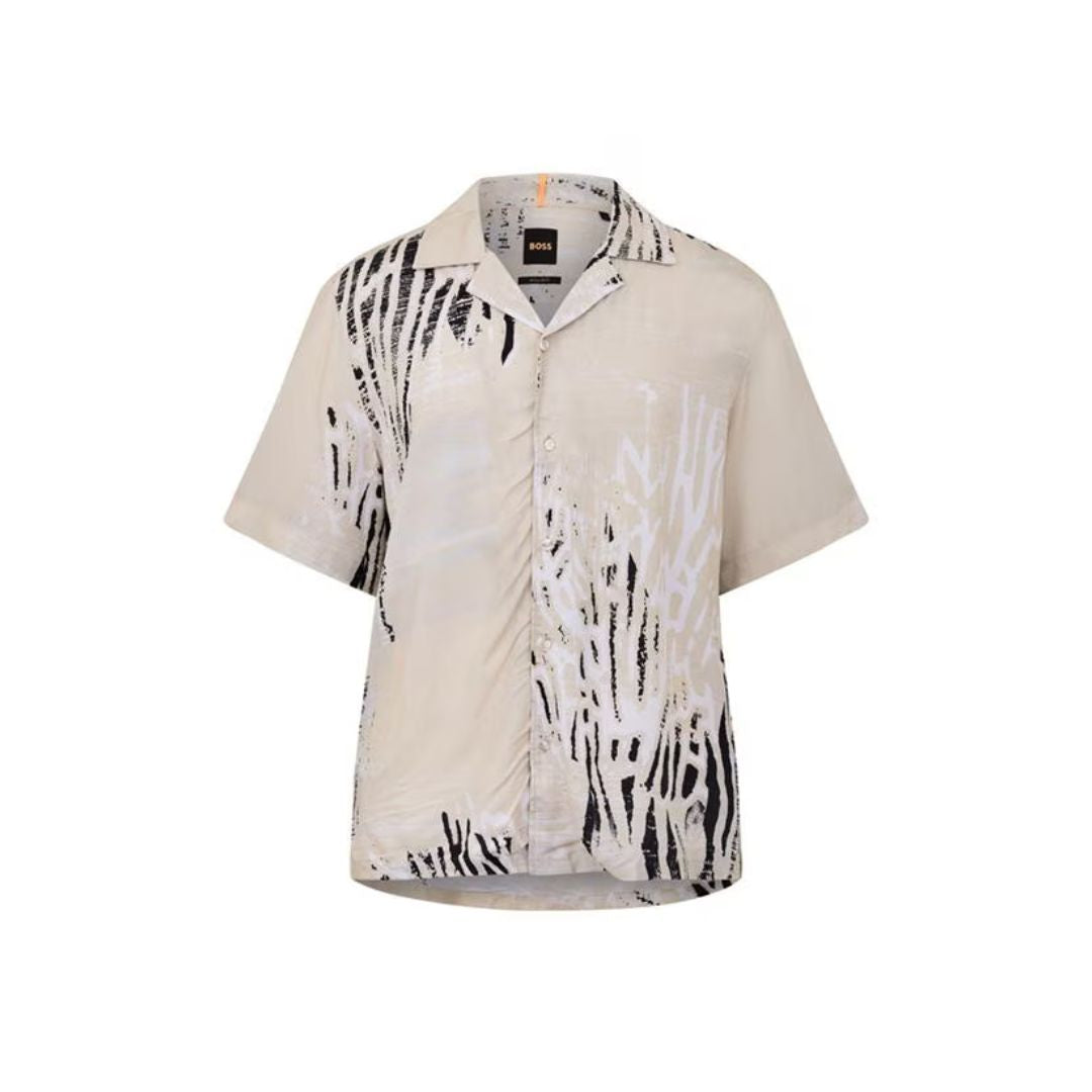 The BOSS Rayer Short Sleeved Shirt is a versatile men's shirt by BOSS, designed in a regular fit with an all-over print. It features a full front button closure with pearlescent buttons, a relaxed collar, and short sleeves for a polished yet effortless look.