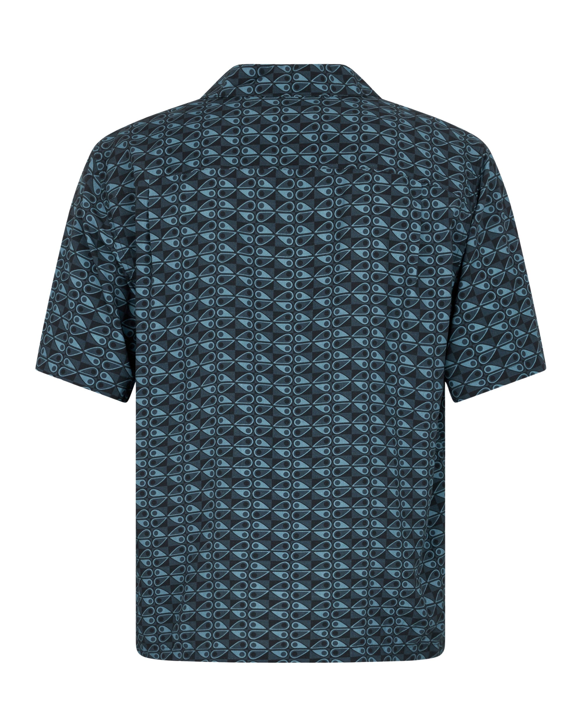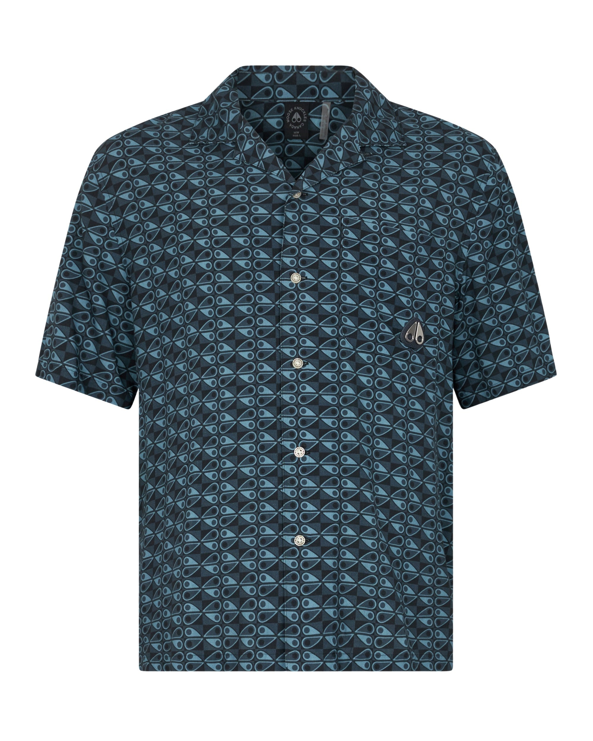 A regular-fit shirt featuring a full button fastening and a Cuban collar with short sleeves. The shirt is adorned with an all-over Moose Knuckles logo design and includes a chest pocket with a metal Moose Knuckles logo badge. A matching swim short is also available.