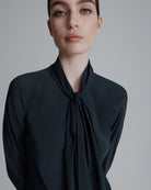 This shirt exudes timeless elegance, elevated by a soft bow at the neck that adds a romantic, feminine touch. Designed with a slightly fitted cut, it features a band collar with a sash detail, a visible button fastening, and a straight hem for a clean, refined silhouette. Whether styled with contemporary-fit trousers or layered under knitwear, it offers both vibrant charm and sophisticated versatility.