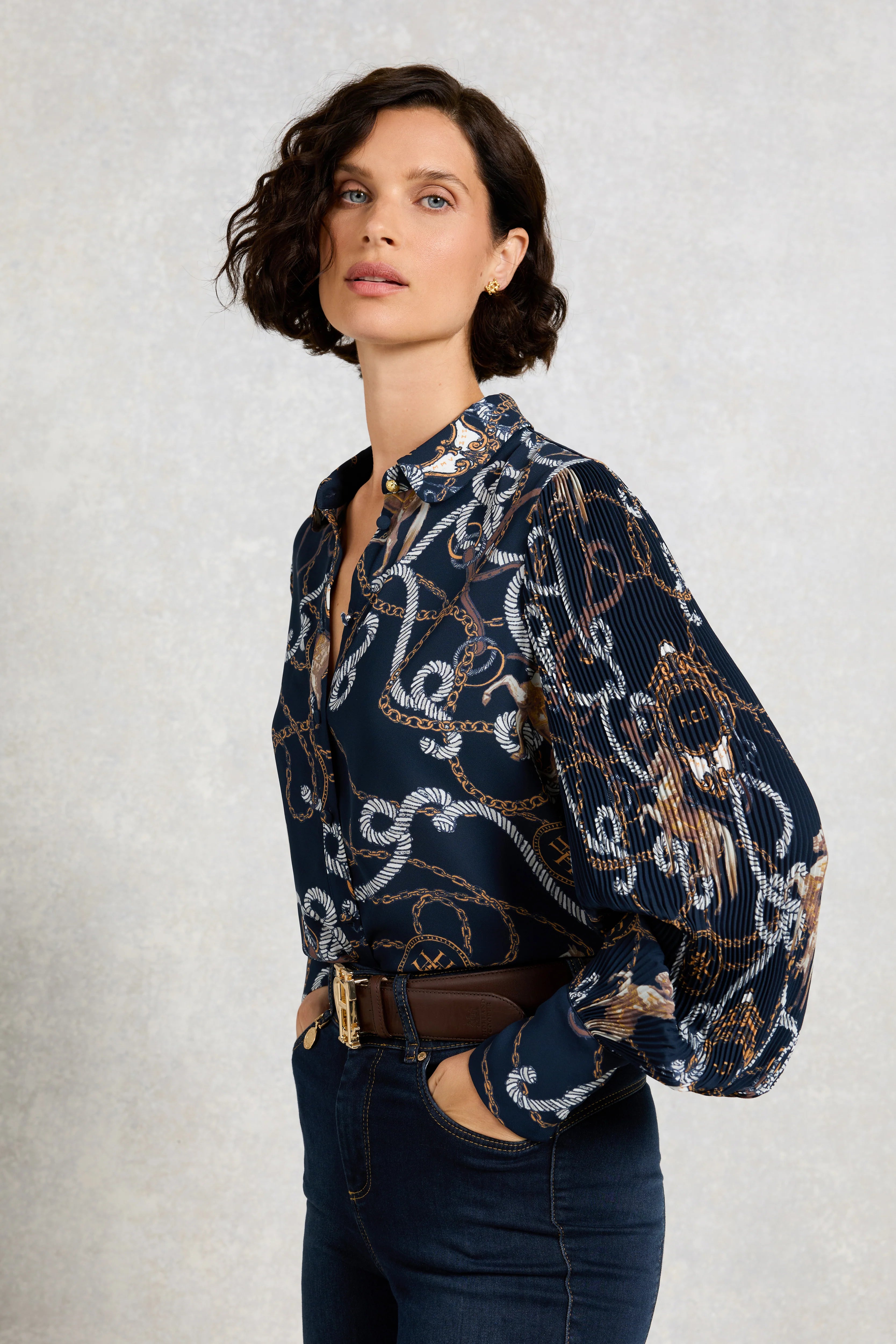 The Beau Shirt elevates statement shirting with its exclusive country horsebit print, blending heritage charm with a timeless design. Made from lightweight fabric, this women's shirt features a classic fit, a softly curved collar, and a full front placket with self-covered buttons for a polished look. Distinctive heat-set pleats on the full-length sleeves add elegant volume and movement, while extended cuffs are adorned with a single gold HC hardware button, providing a refined finishing touch.