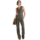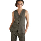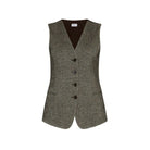 A winter-ready take on the timeless gilet, this design is crafted from crinkle-look wool and a twill-blend tweed fabric for a refined finish. The feminine cut features a fitted waist and V-neckline, complemented by welt side pockets and a visible button fastening. Fully lined for comfort, it is completed with a back tie for adjustable shaping. Perfectly paired with the matching trousers, it can be worn alone or layered over a shirt for a sophisticated mix-and-match look.