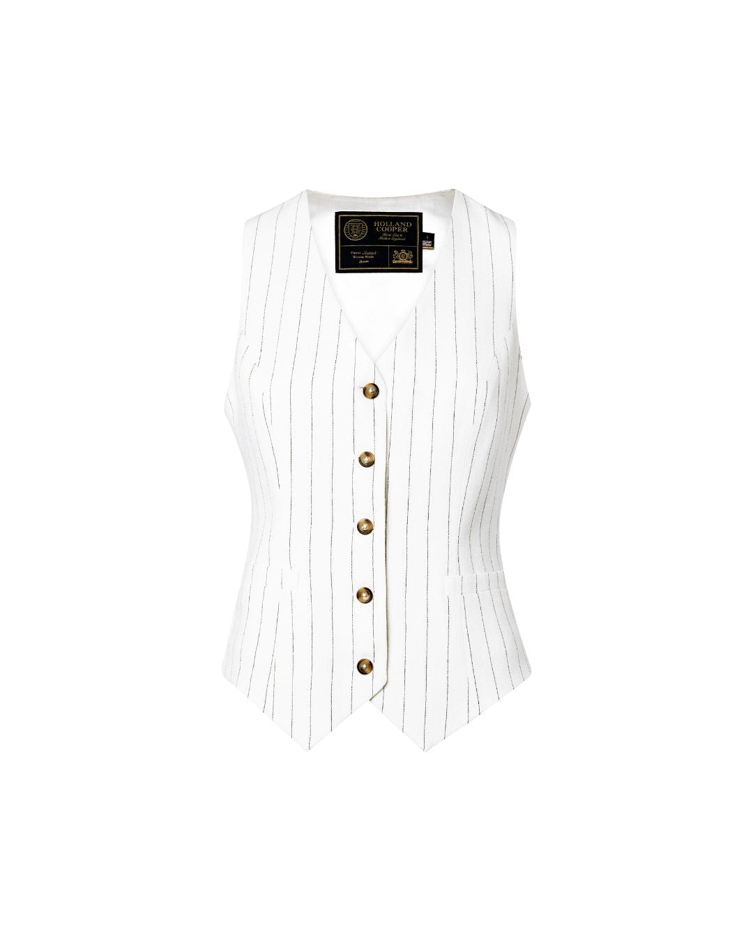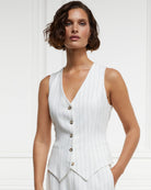Timeless and sophisticated, this linen waistcoat features a slim tailored fit, a sleek V-neckline, and an elegantly shaped hem. A versatile wardrobe essential, it showcases classic suiting details, including neat welt pockets, a satin lining, and a darted front for a refined silhouette. The adjustable back ensures a personalized fit, while HC horn buttons add a subtle touch of distinction. Wear it effortlessly with matching trousers, as a stylish layering piece, or as part of a three-piece suit.