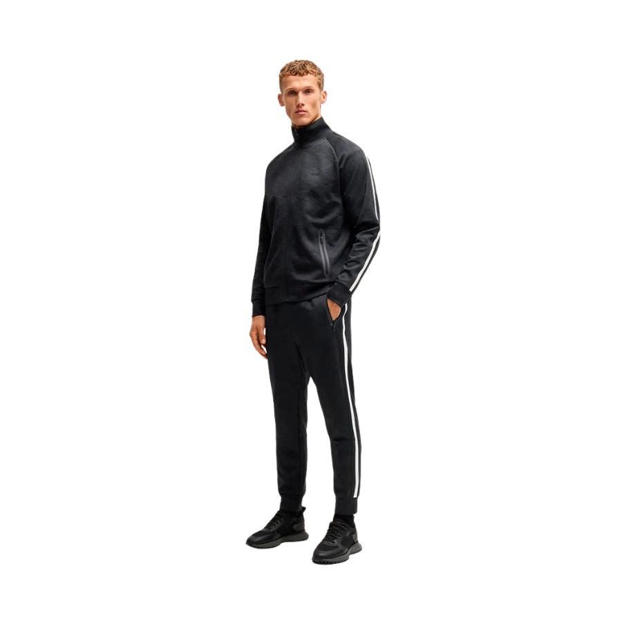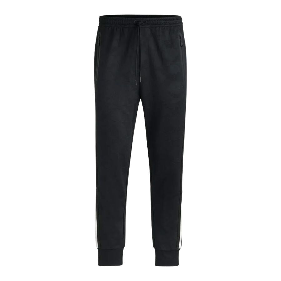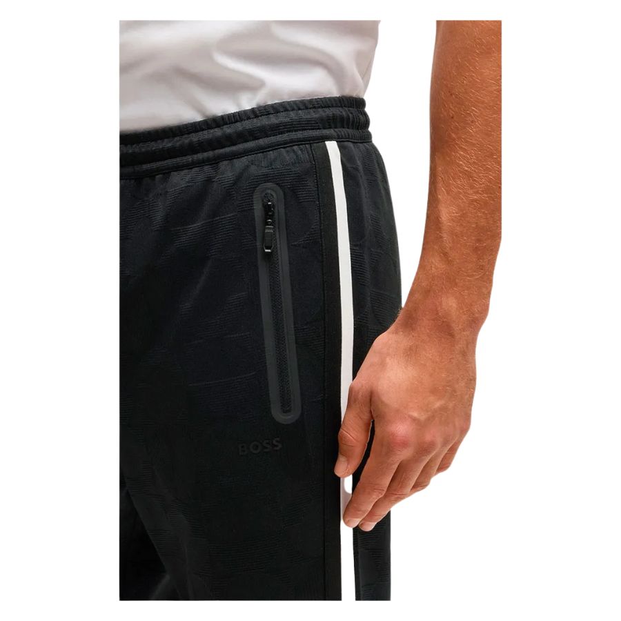 Redefine casual sophistication with these BOSS Menswear tracksuit bottoms, designed for those who refuse to compromise on style. The relaxed silhouette features a subtle tonal pattern that adds visual depth, whilst sporty side stripes inject contemporary edge. Practical zipped side pockets and a rear welt pocket provide secure storage, and the adjustable drawstring waist ensures a personalised fit. Crafted for effortless versatility, these bottoms transition seamlessly from leisurewear to smart-casual occasions, making them an indispensable addition to the modern gentleman's collection.