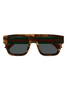 These square-shaped sunglasses feature a flat top bar and a versatile, commercial silhouette. The medium-width temples showcase the iconic Web detail in signature Green-Red-Green and Blue-Red-Blue combinations, accented by Gucci's new gold or silver lettering logo. A cool yet classic color palette completes the look.