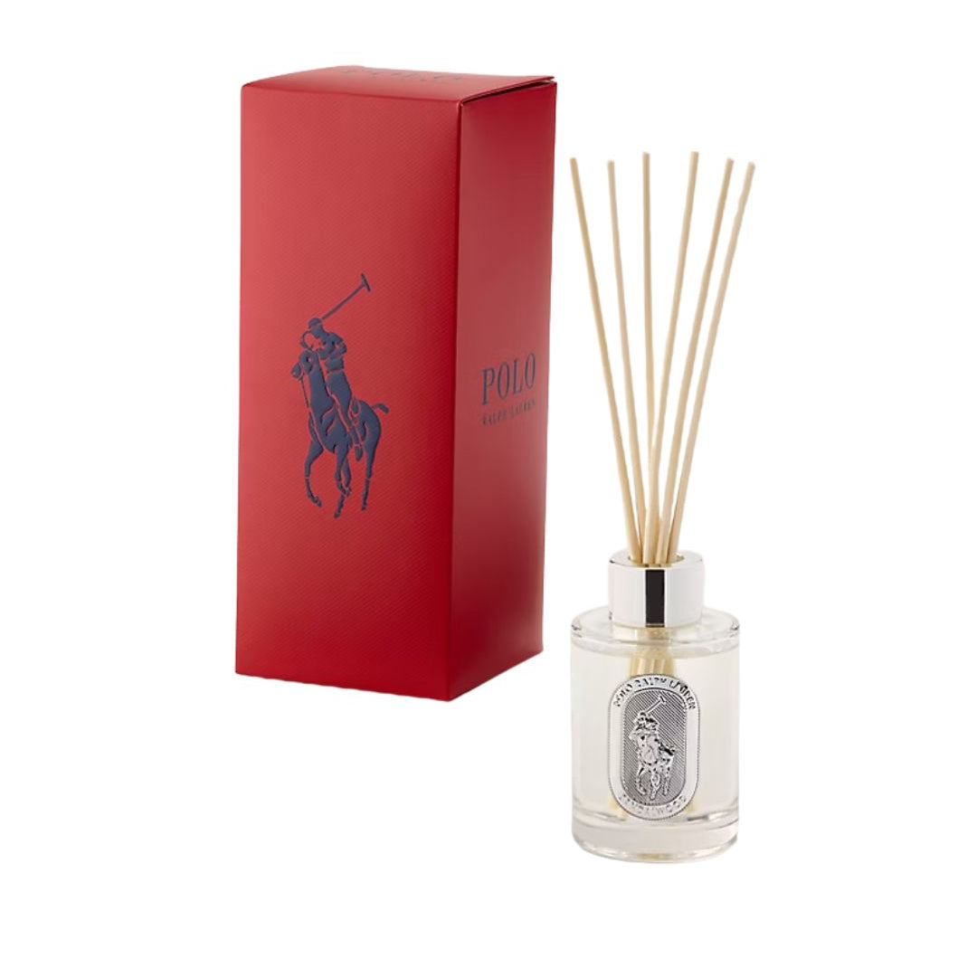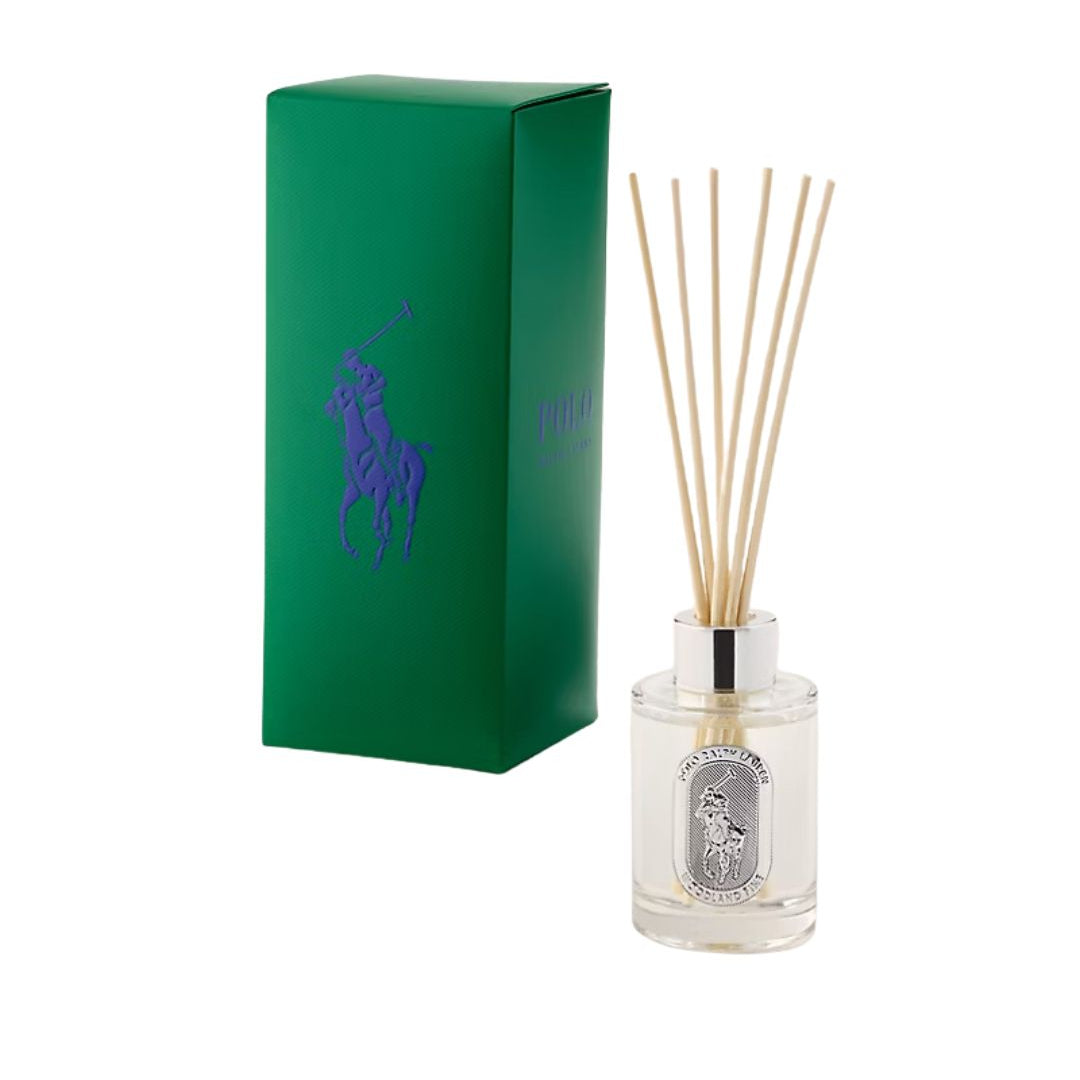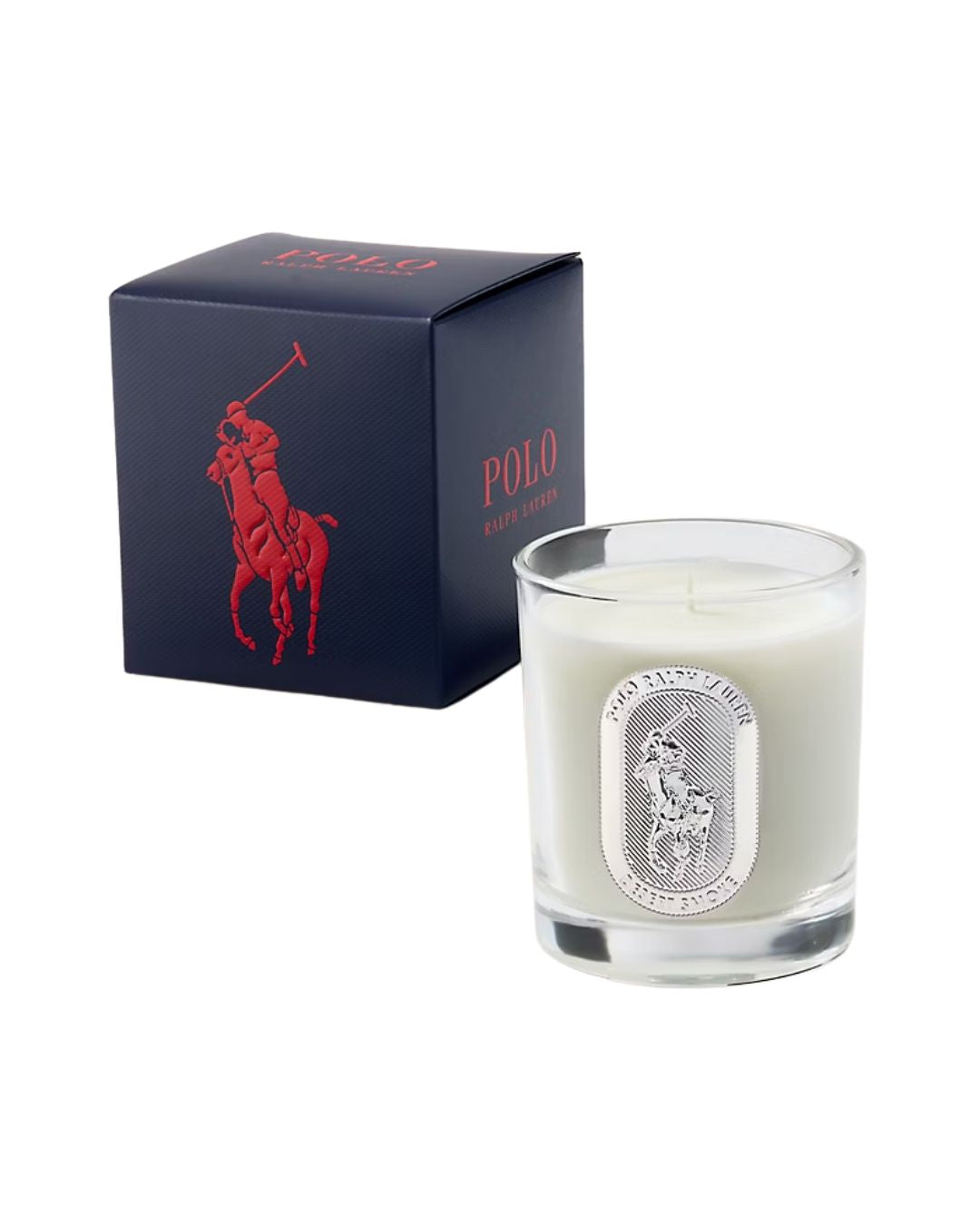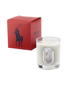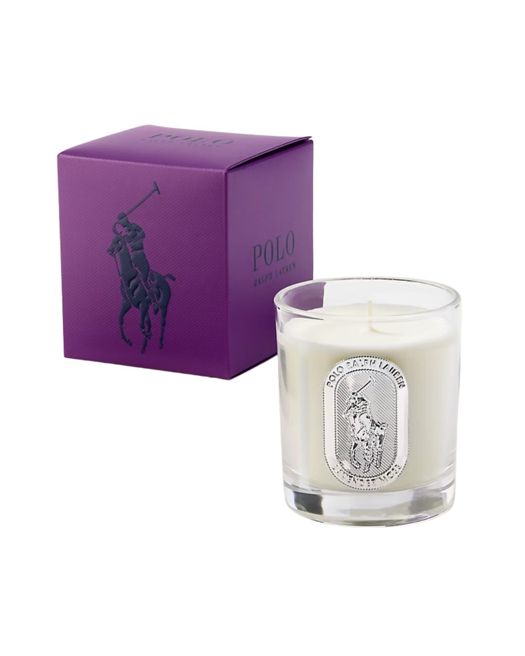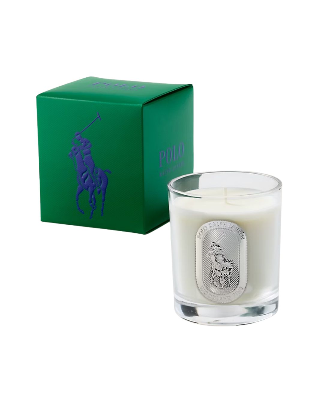 Glass vessel adorned with a metal emblem showcasing Ralph Lauren signature Pony and logo.