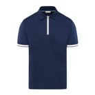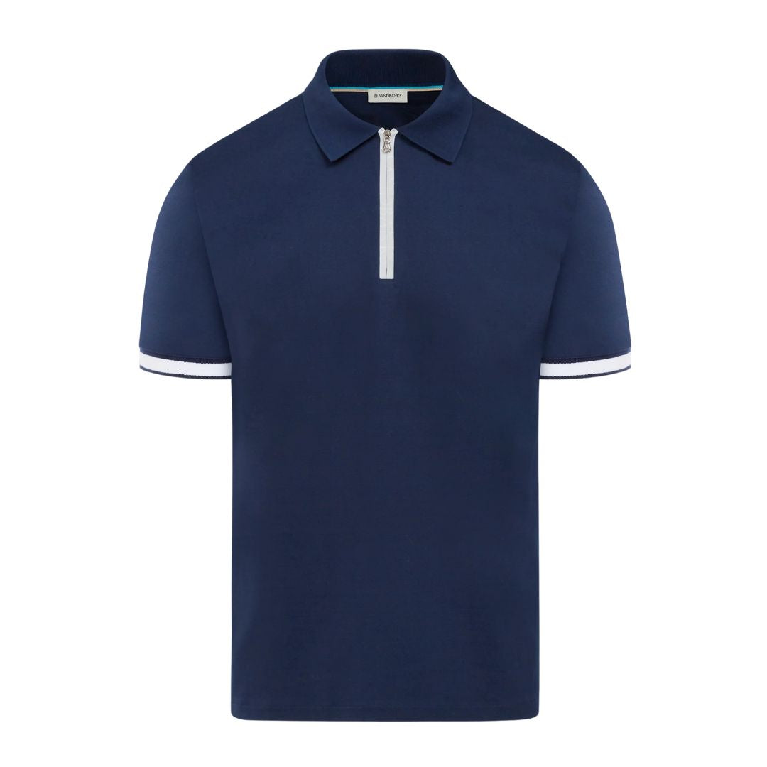 Introducing the Sandbanks Men's Silicone Zip Polo Shirt in white, crafted from 100% mercerized interlock cotton. This timeless polo shirt boasts a classic fit, accentuated by a central Lampo silicone zip in black with print. It features the iconic Sandbanks rubber badge on the arm, along with black-tipped knitted cuffs and tri-colour back neck binding for added style.