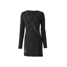 The Agen Abito Crepe Stretch Dress features a low-cut V-neckline, a zip fastening, and a plain pattern, with additional details including a zip closure and slip design.