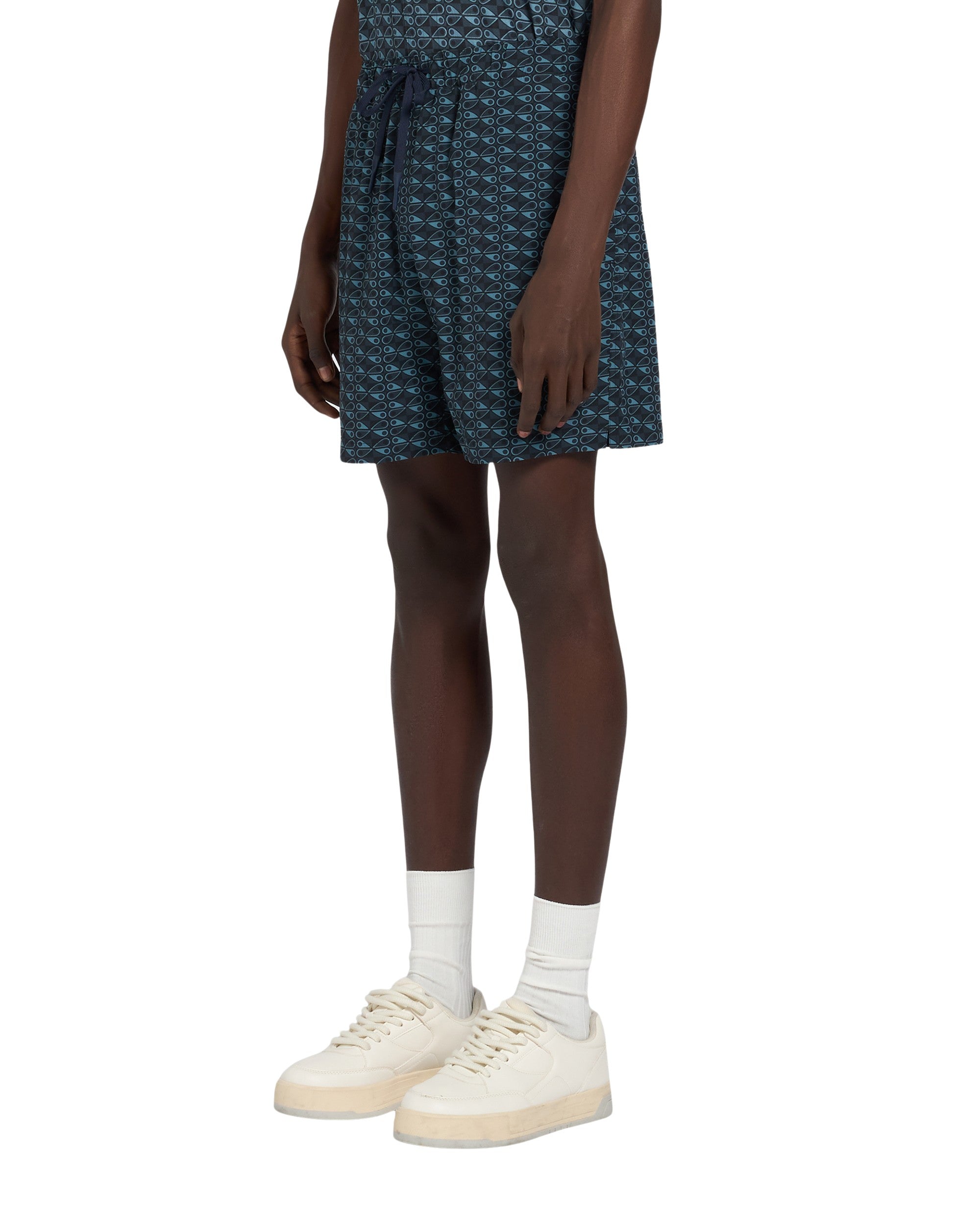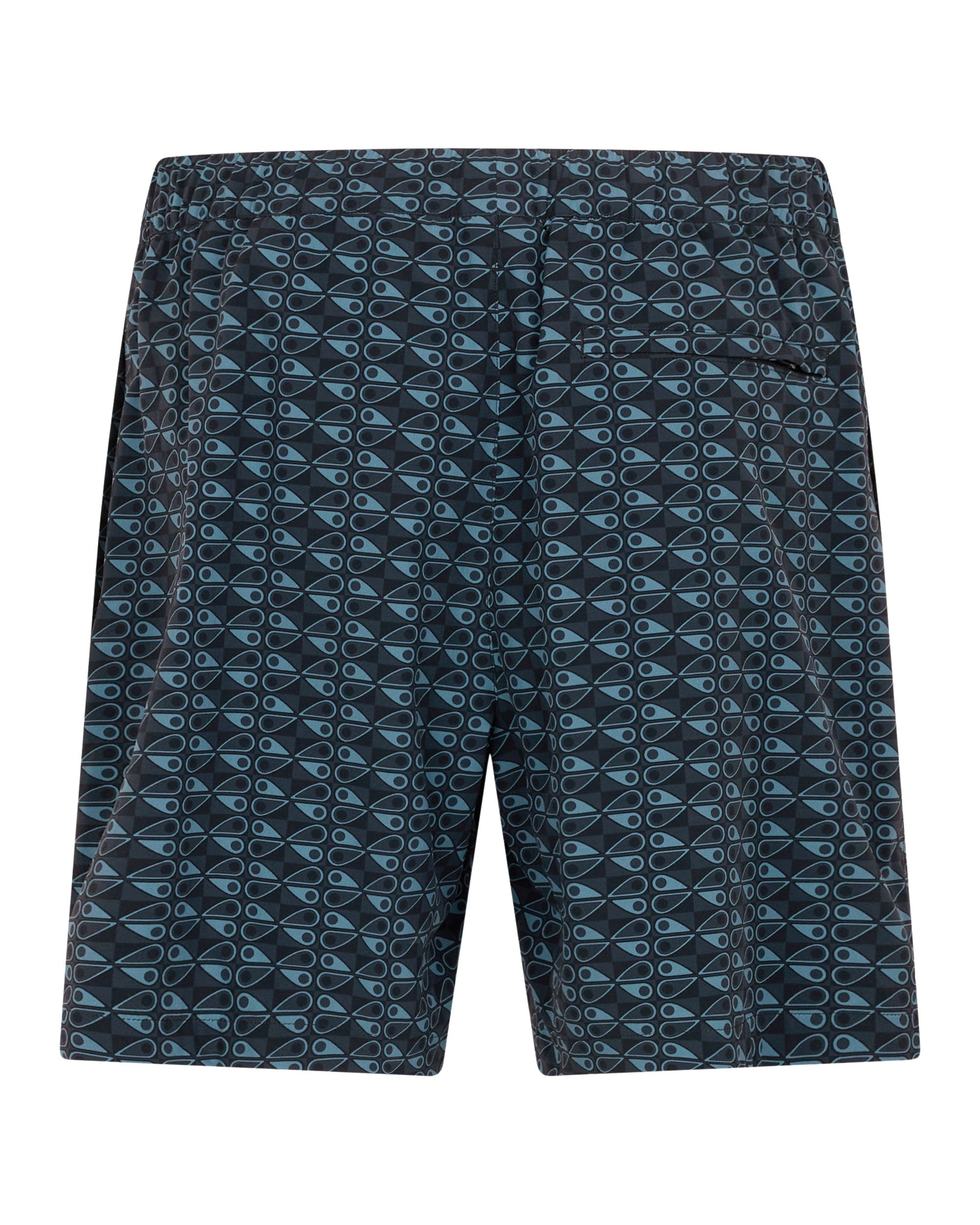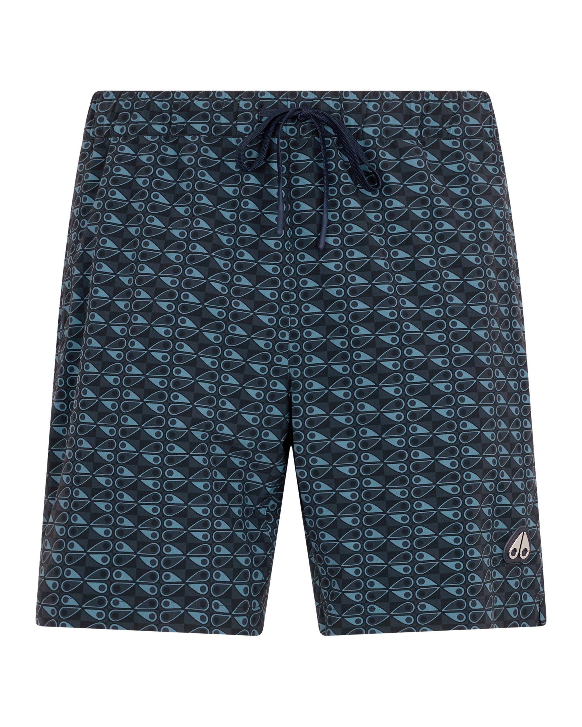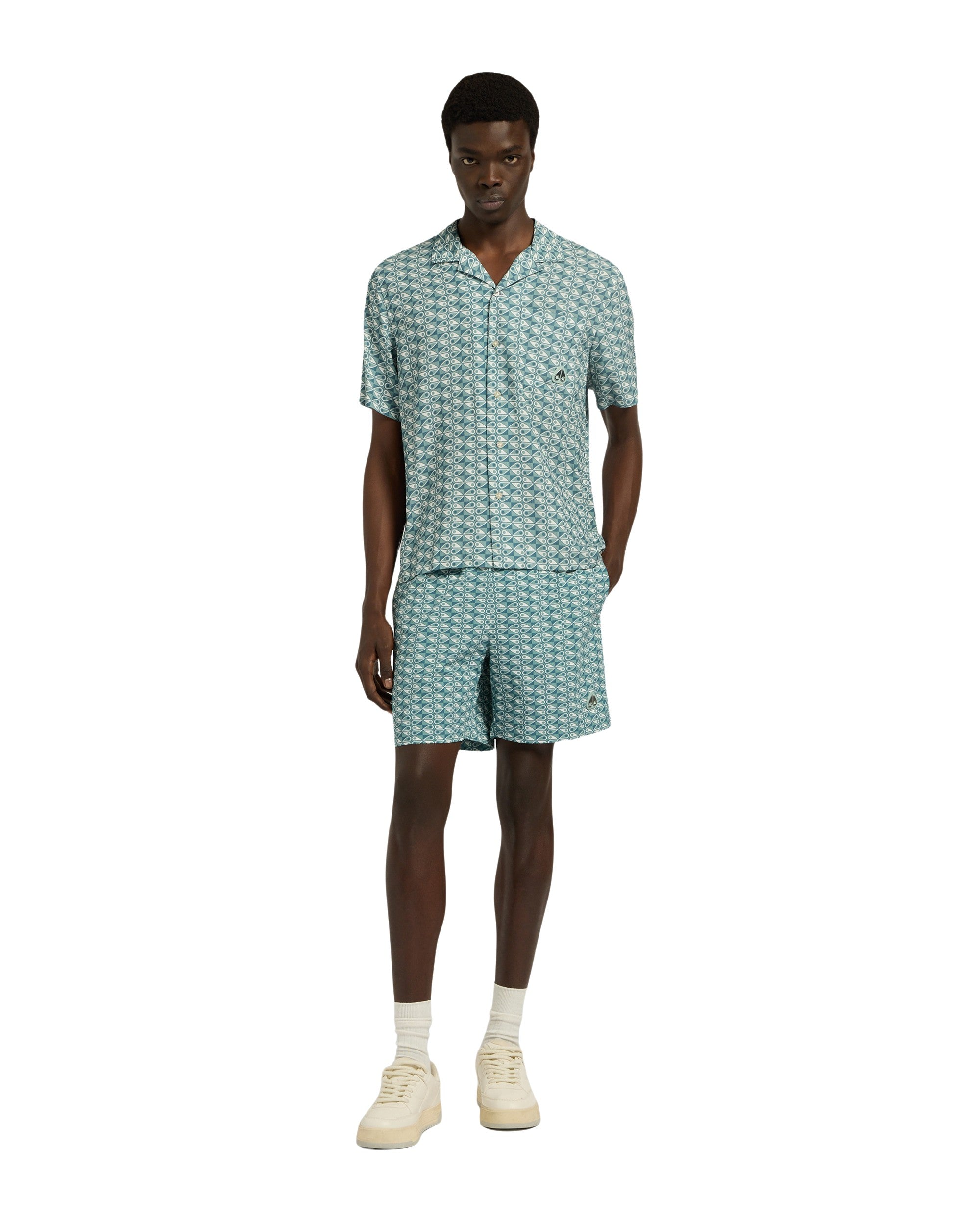 A regular-fit shirt featuring a full button fastening and a Cuban collar with short sleeves. The shirt is adorned with an all-over Moose Knuckles logo design and includes a chest pocket with a metal Moose Knuckles logo badge. A matching swim short is also available.