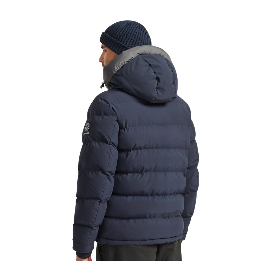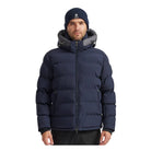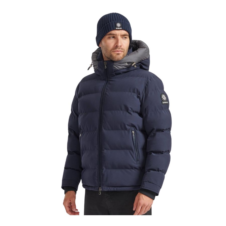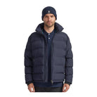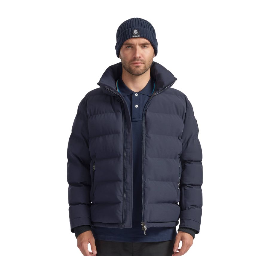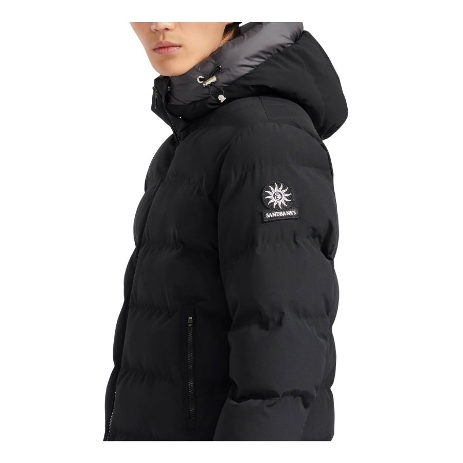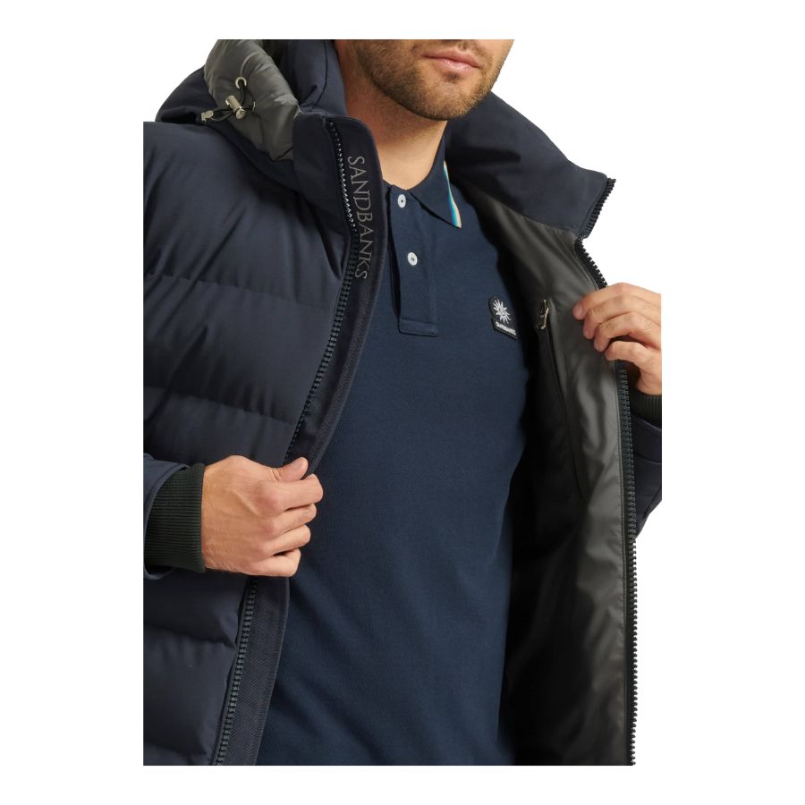 The Banks Puffer Jacket combines contemporary design with sustainable craftsmanship. This mens Sandbanks coat features a front two-way Lampo tone-on-tone zip with gunmetal pullers and a detachable hood, this jacket offers versatile styling for transitional seasons. The Sandbanks embroidered arm badge and laser-engraved brush metal components in gunmetal add refined detail, whilst Ecodown insulation and recycled polyester construction reflect a commitment to environmental responsibility. Practical elements include concealed and fleece-lined side zip pockets, an internal zip pocket, and storm rib cuffs for enhanced comfort. The signature logo cord adjuster and internal elasticated hem ensure a tailored fit. True to size.