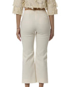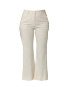 These Marella trousers are a sleek and sophisticated wardrobe essential, designed in a soft off-white hue that effortlessly elevates any outfit. Crafted from a stretch fabric blend, they offer both comfort and structure with a high-rise waist and subtly flared leg for a flattering, elongated silhouette. Tailored details like the belt loops, side slit pockets, and pressed creases add a polished finish, making them ideal for office wear, formal occasions, or chic everyday styling. Pair with a blazer or a tucked-in blouse for timeless elegance.