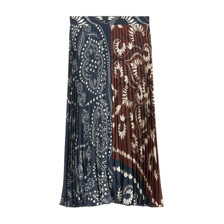 The Milord skirt showcases Weekend MaxMara's refined aesthetic with its mid-rise A-line silhouette and elegant pleated construction. Featuring a striking colour block design that merges two complementary paisley prints, this piece delivers understated sophistication with visual impact. The thoughtful print combination creates a distinctive statement while maintaining the polished elegance the brand is known for. Perfect for elevating everyday wear or layering into more formal occasions.