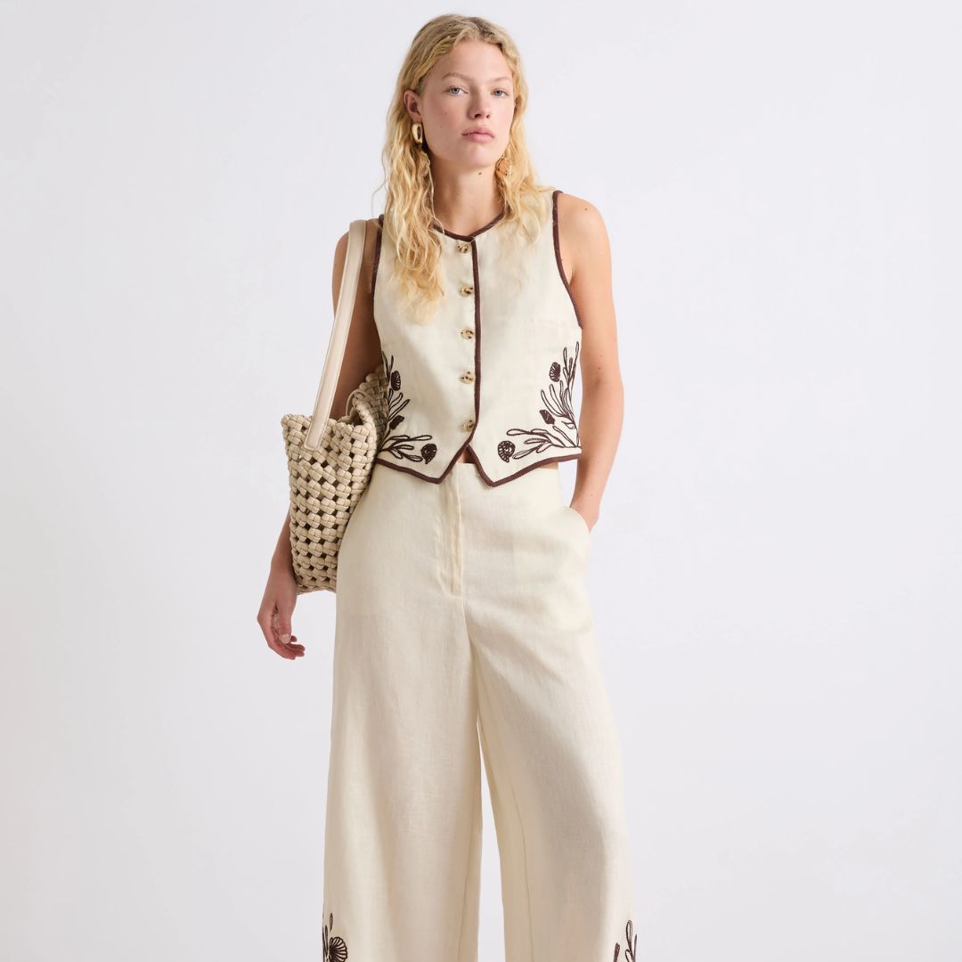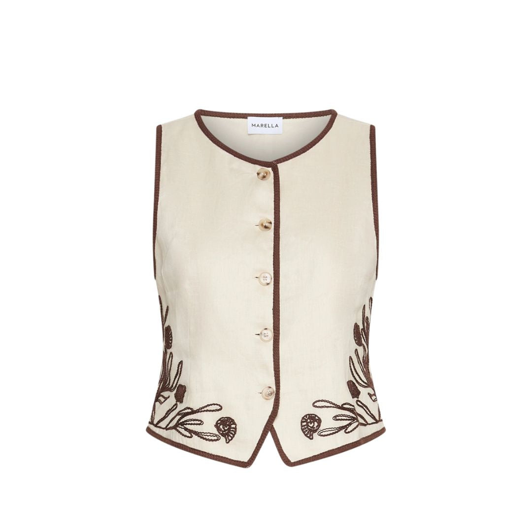 Refine your wardrobe with this sophisticated Marella Aerovia Embroidered Linen Womens Waistcoat. Crafted from quality linen, this sleeveless piece features delicate embroidery and striking contrasting colour edges that add visual interest to any outfit. The single-breasted design and regular cut provide a flattering, versatile silhouette, while the soft lining ensures all-day comfort. Perfect for layering over shirts or dresses, this waistcoat transitions effortlessly from casual to smart occasions.