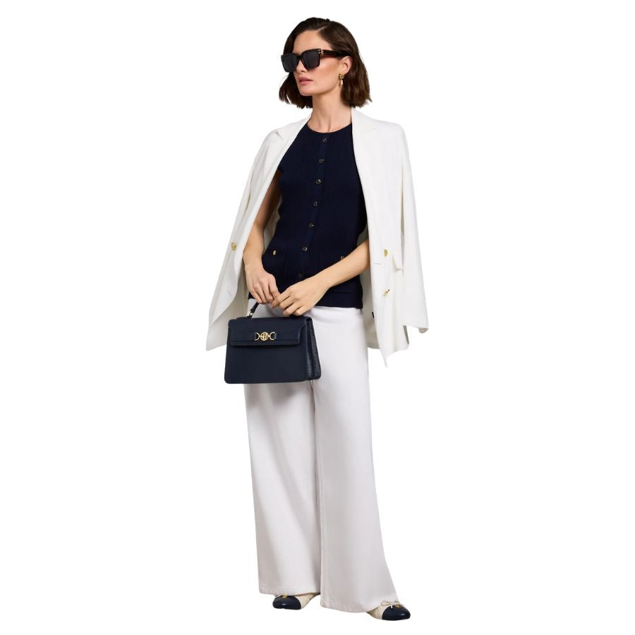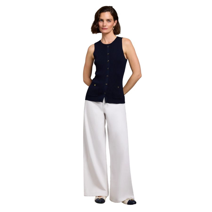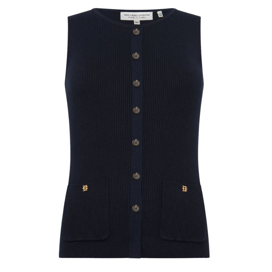 This women's Holland Cooper Knitted Tank is a refined yet effortlessly wearable piece, designed to bring a touch of heritage charm to your wardrobe. Its regular fit and ribbed texture flatter the figure, while subtle front detailing and faux pockets add a signature Holland Cooper touch. Heraldic HC rivets and tortoiseshell buttons complete the classic finish. Perfect worn on its own or layered, the Aubrey Knitted Tank is a timeless piece that blends understated sophistication with everyday ease.