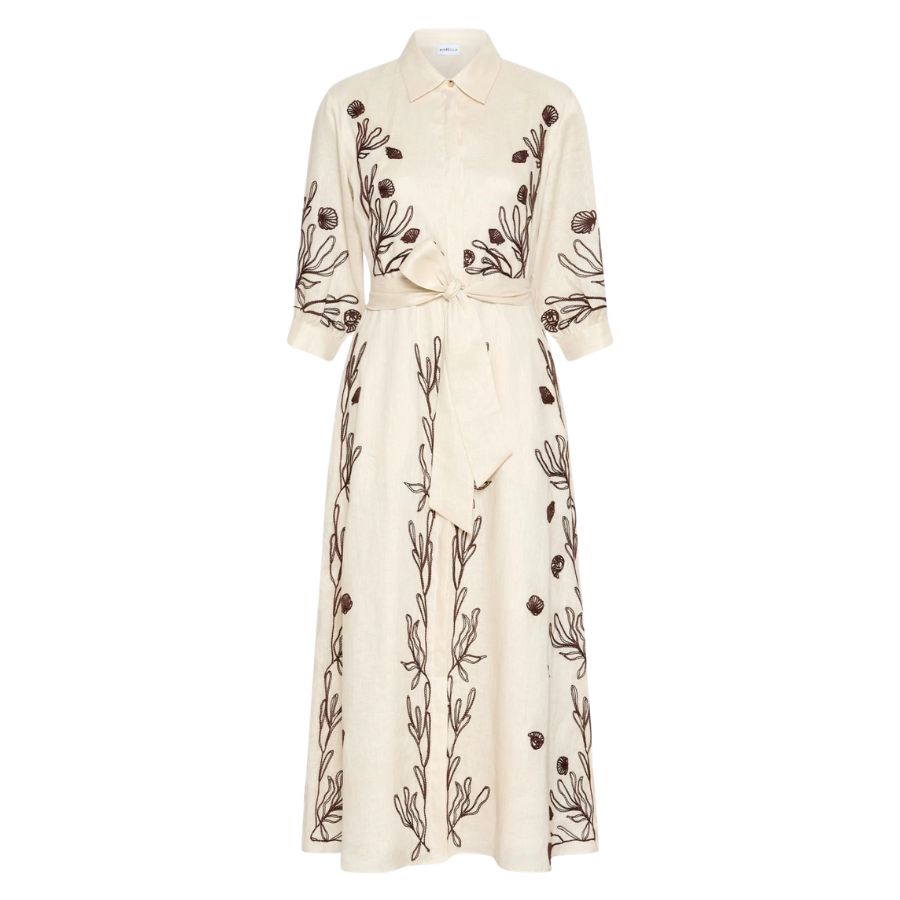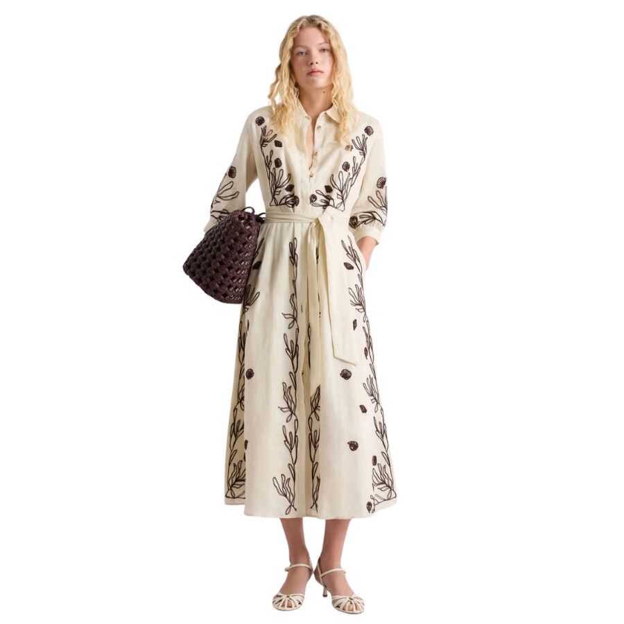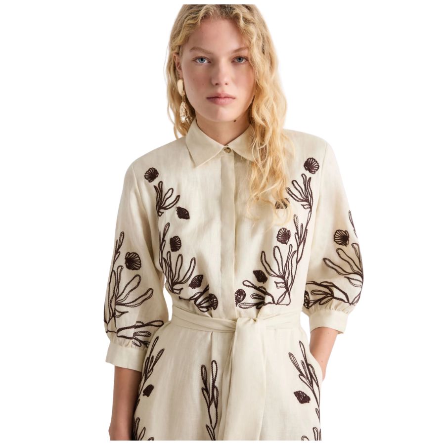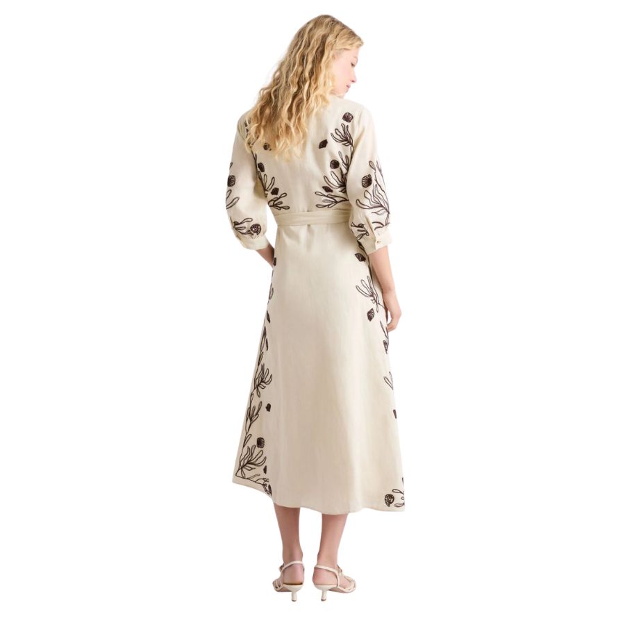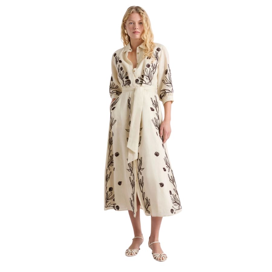 Elegant linen dress crafted with delicate embroidery and soft cotton lining for comfort and breathability. Features a classic shirt collar with concealed button fastening and practical inset side pockets. Three-quarter sleeves finished with cuffs, buttons and subtle gathering detail. The flared skirt is defined by a waist seam and includes a coordinating fabric belt for a polished silhouette. Regular cut design suits a variety of body shapes. Perfect for warm weather occasions, from casual outings to garden gatherings.