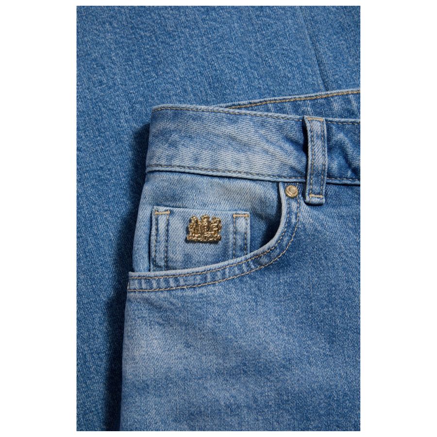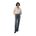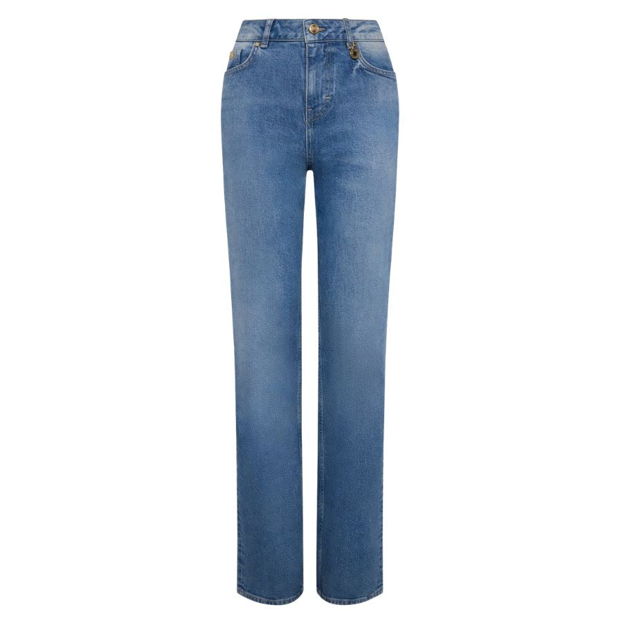 These jeans are designed with timeless five-pocket styling and a secure single-shank waistband closure for a comfortable fit. Finished with signature gold hardware, they feature a flattering high-rise waist that enhances the silhouette. The long, straight leg is defined by an outward seam, offering a subtle nod to retro fashion. Striking the ideal balance between wide and slim, the leg shape delivers vintage charm with modern ease. Perfect for dressing up or down, these jeans are a versatile wardrobe essential that radiates effortless style.