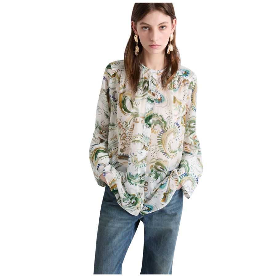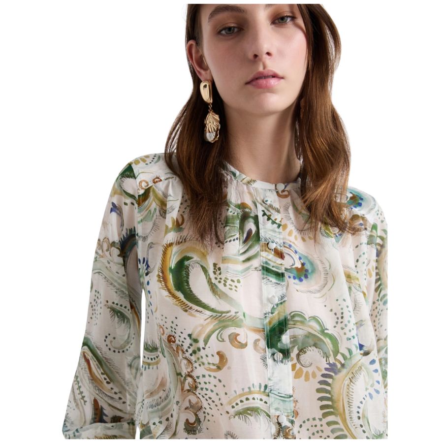 This Marella women's silk shirt is Loose and lightweight, the silk voile shirt will bring sophisticated elegance to your warmest days. The gathered shoulders and side slits add movement and versatility. Perfect for layering or wearing solo, this piece transitions effortlessly from casual daytime wear to evening occasions. The fluid fabric drapes beautifully while maintaining its shape, making it an essential addition to any warm-weather wardrobe.