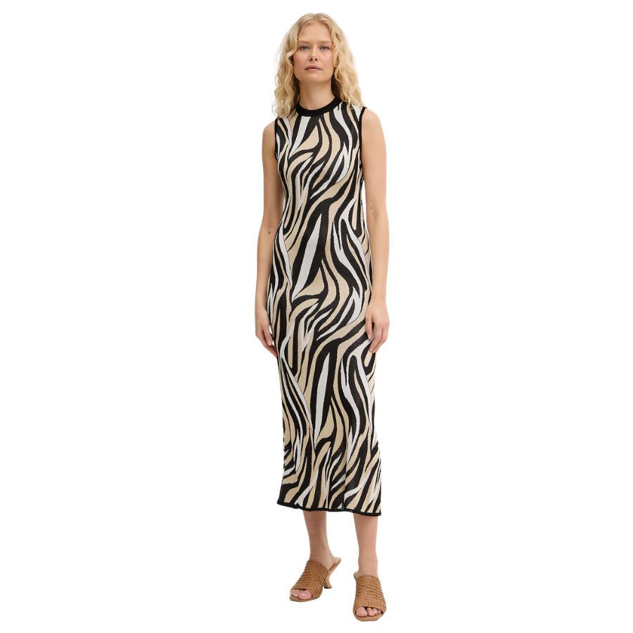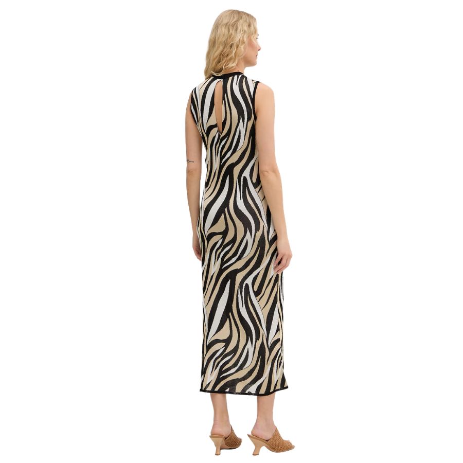 This Marella Womens Dress combines bold style with contemporary design. This sleeveless piece features a striking zebra print that makes an instant statement. The open back slit adds an elegant touch of sophistication, while the left leg slit provides movement and modern flair. Perfect for occasions where you want to stand out with confidence and grace.