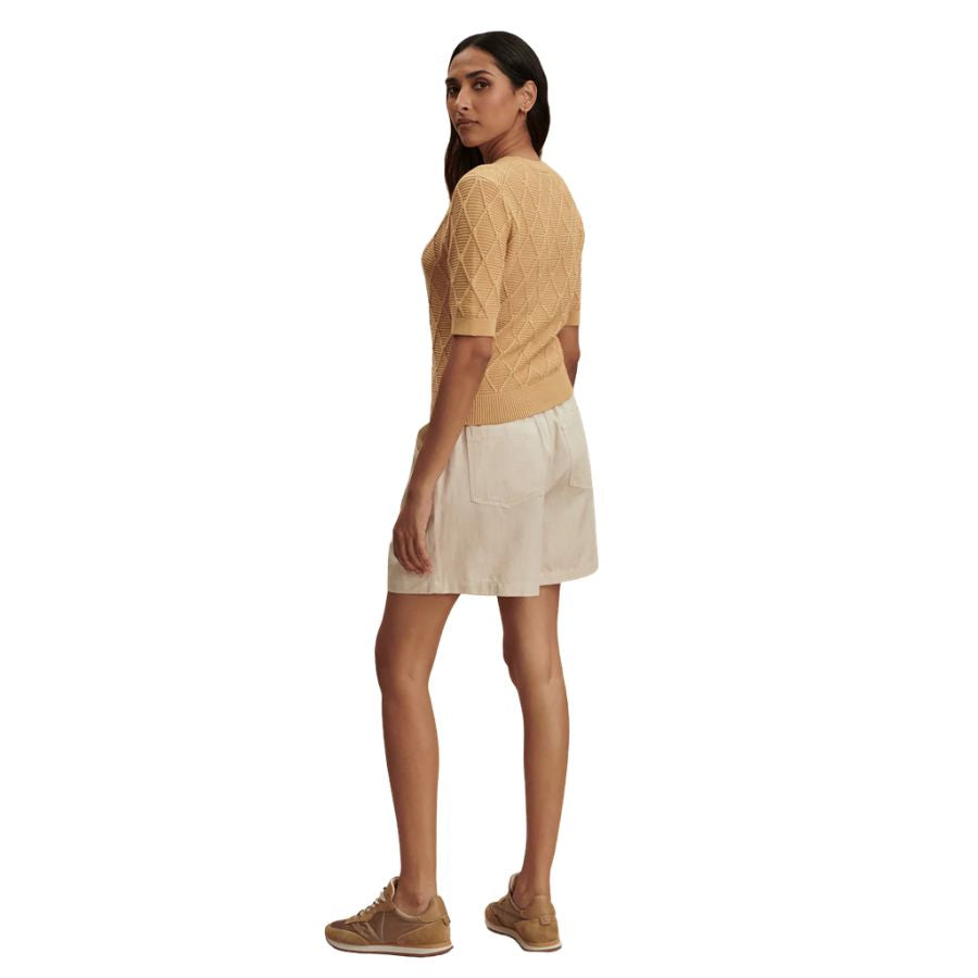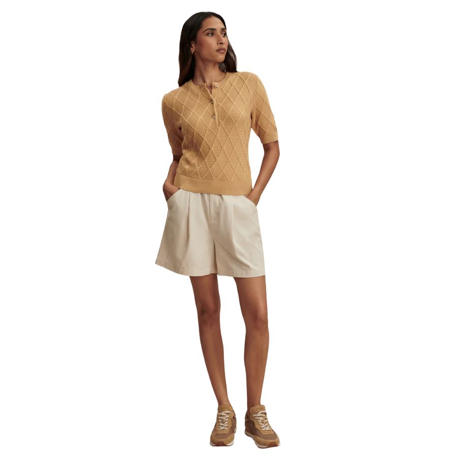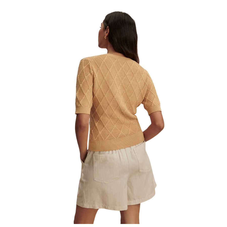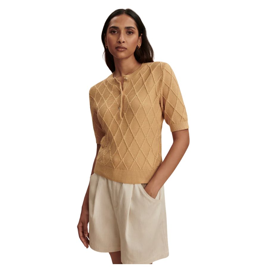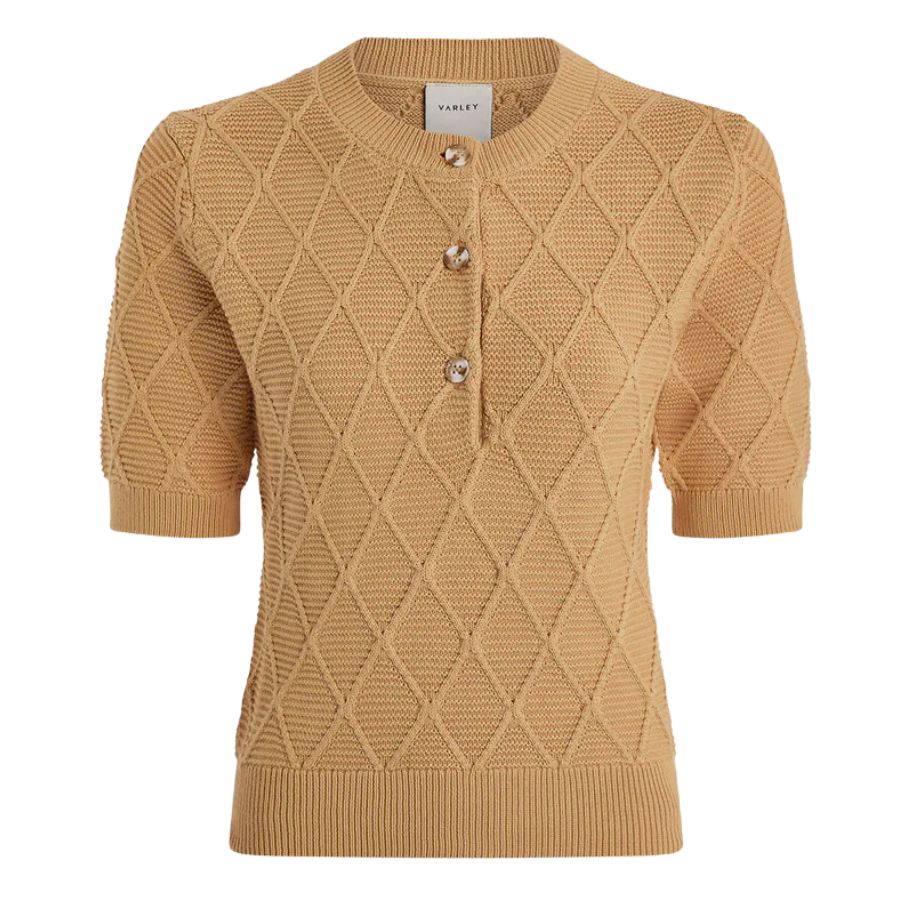 The Merryn Diamond Knit is a versatile layering essential for spring and summer. This womens Varley knit features a striking diamond cable stitch across the chest, complemented by ribbed trims for a refined finish. Short sleeves keep you cool in warmer weather, while the three-button fastening adds practical style. Crafted from 100% cotton, it's breathable and comfortable for all-day wear. Perfect worn open over a vest or layered under lightweight pieces.