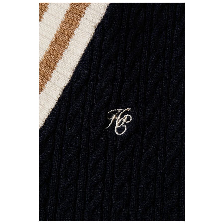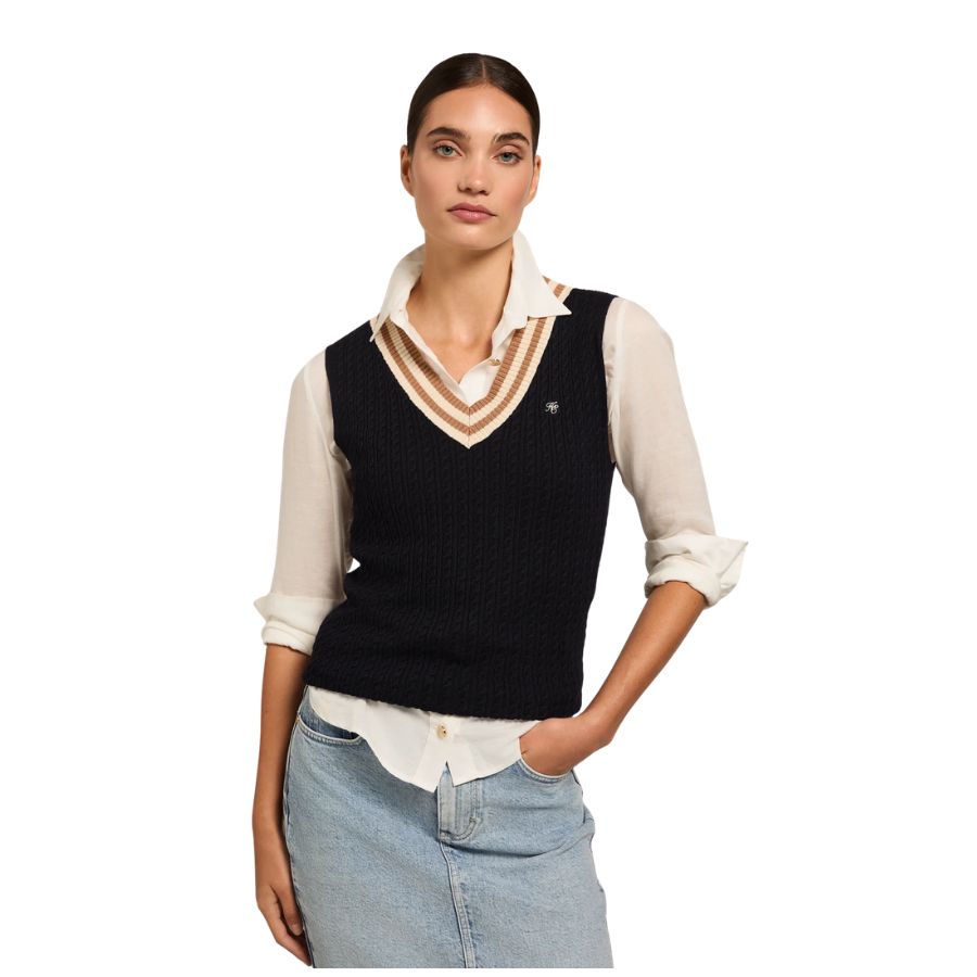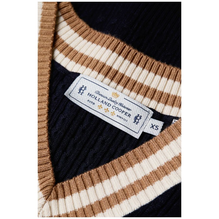 Crafted from a luxurious blend, this Holland cooper women's sleeveless top offers a smooth, flattering fit that contours gracefully to the body. The design features a sophisticated play of textures with contrast rib stripes and intricate cabling throughout the body, adding a touch of classic charm. This slim-fit tank is an impeccable choice for both casual and elevated ensembles, promising versatility and style.
