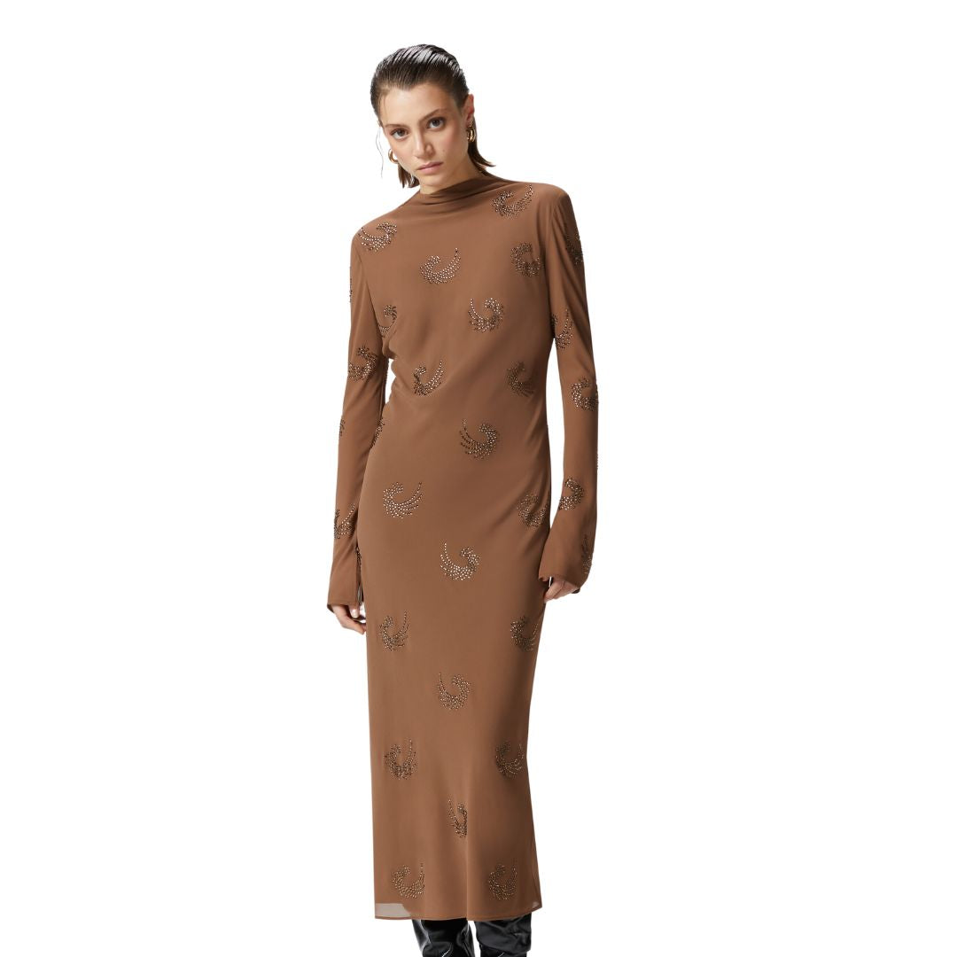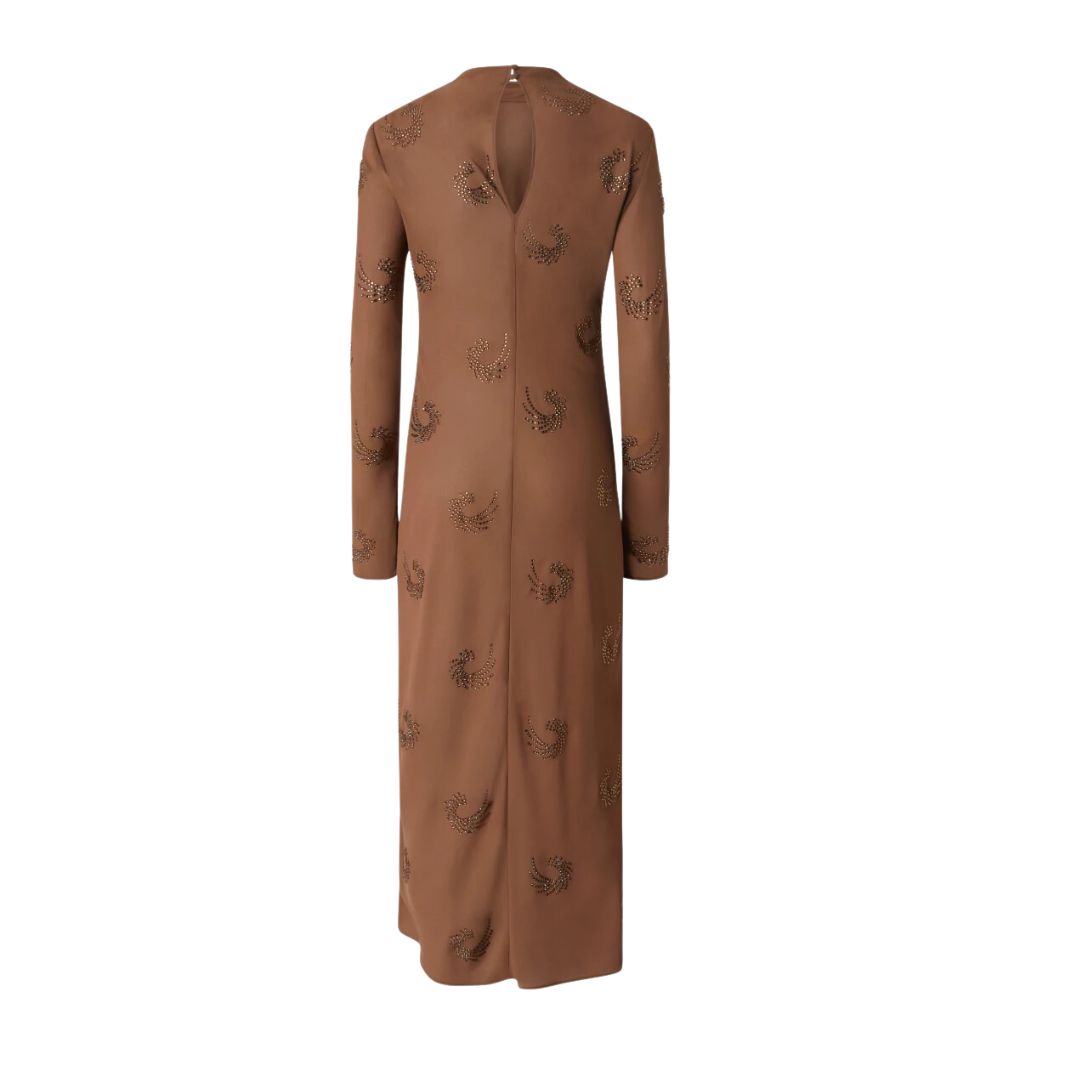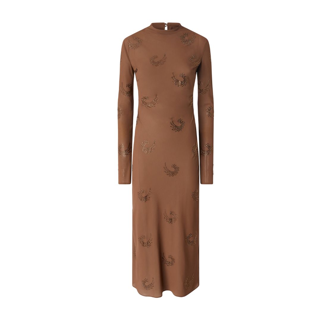 This ankle-length dress is crafted from ultra-light georgette and adorned with rhinestone applications that create a delicate swirl pattern throughout. Featuring a straight silhouette, the dress is finished with a stand-up collar, long sleeves with slightly dropped shoulders, and a keyhole closure with double buttons at the back of the neck. Lined to reduce the sheer effect typical of georgette, this piece embodies feminine elegance. With its refined details, it’s the perfect choice for achieving a sophisticated and effortless look with a hint of sparkle.