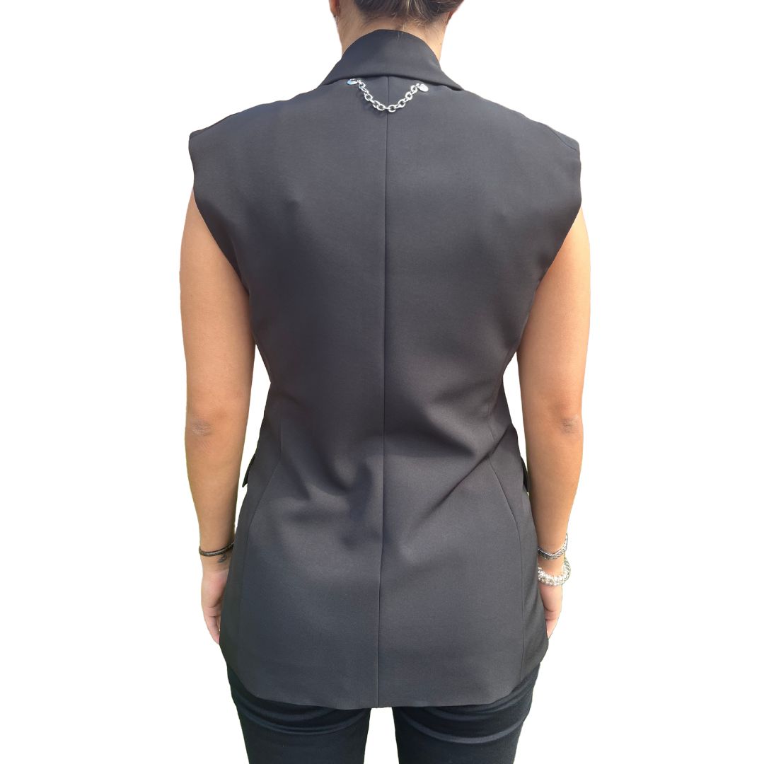 The Moschino women's Cady waistcoat is a chic, tailored piece crafted from luxurious Cady fabric for a sleek, structured silhouette. With a single-breasted design and button closure, it combines sophistication with modern elegance. Perfect for both formal and smart-casual looks, this waistcoat adds a fashion-forward touch to any outfit.