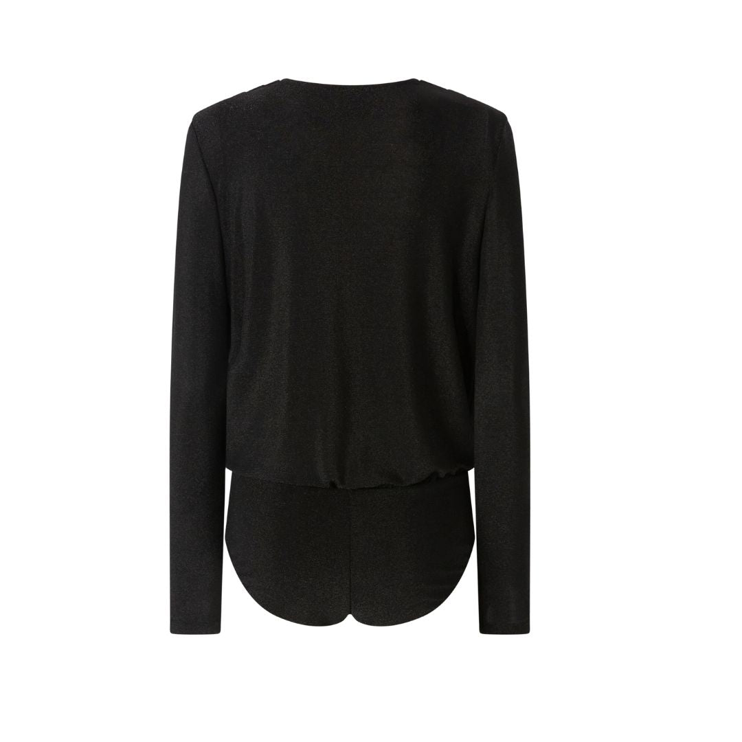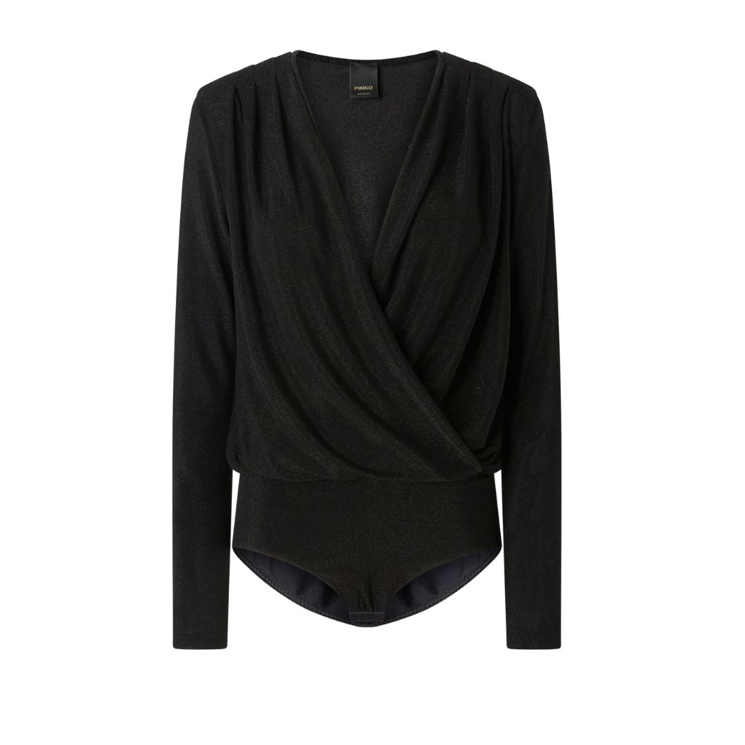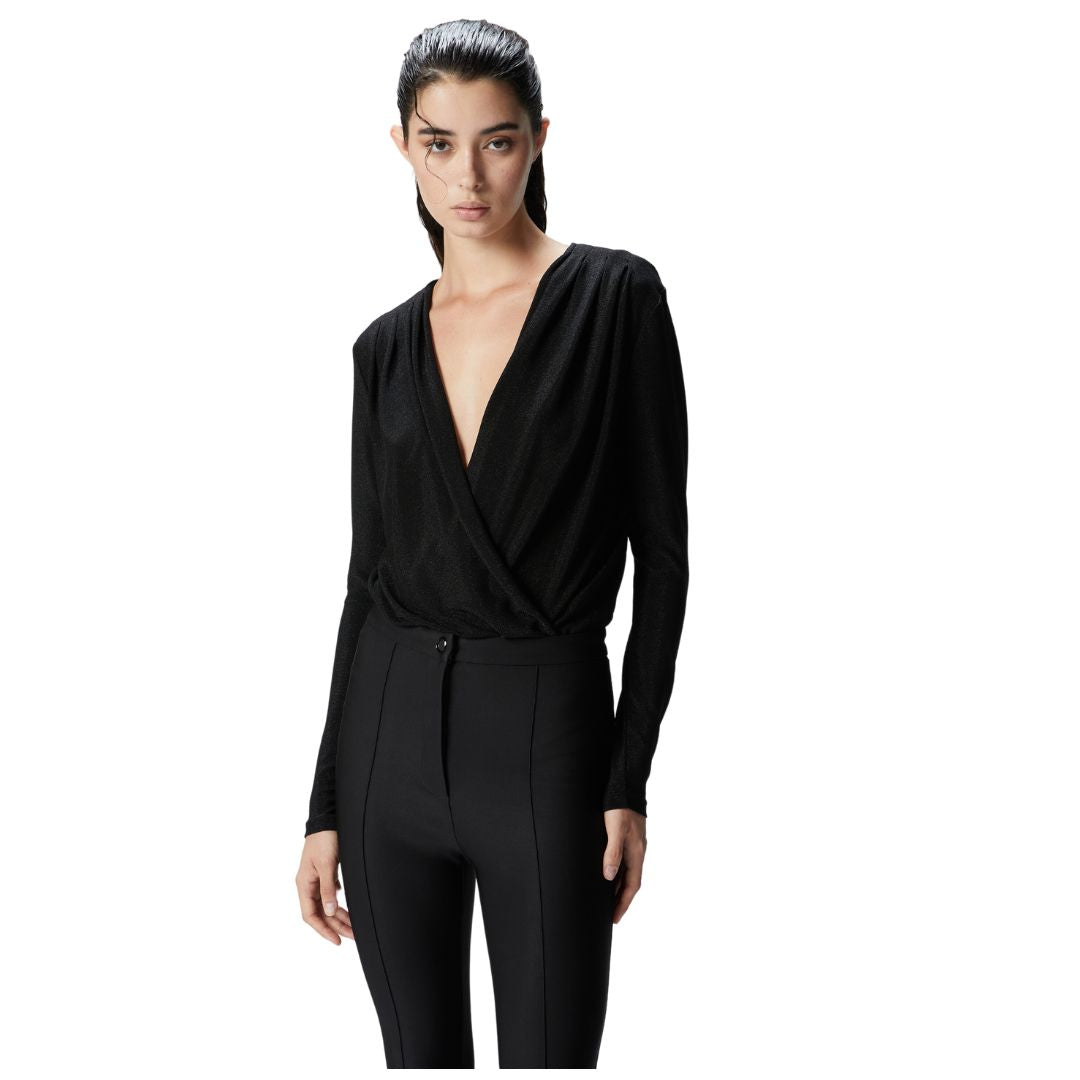 This women’s long-sleeve bodysuit is crafted from stretch viscose jersey, featuring a distinctive and elegant metallic effect. The front-crossed silhouette, complemented by draped details, adds a touch of femininity to the piece. It serves as an essential addition to any evening ensemble, offering a subtle yet sparkling and sophisticated flair.