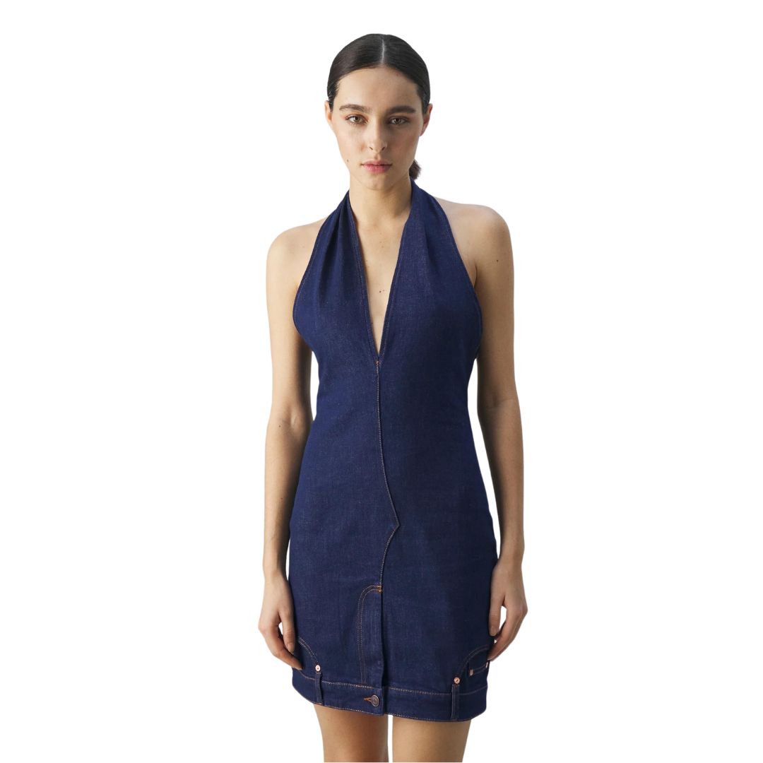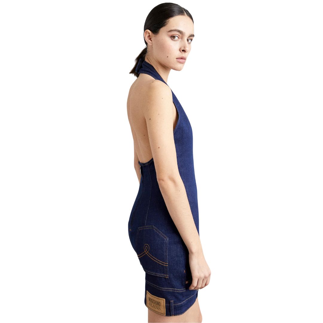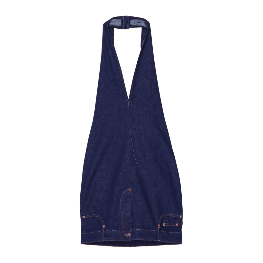 This unique backless design combines striking style with modern edge, featuring a chic standing collar and a distinctive denim jean-inspired design. The playful blend of sophistication and casual flair makes it a standout piece, perfect for making a bold fashion statement. Ideal for evening wear or stylish events, this piece adds a touch of unexpected elegance and creativity to any wardrobe.