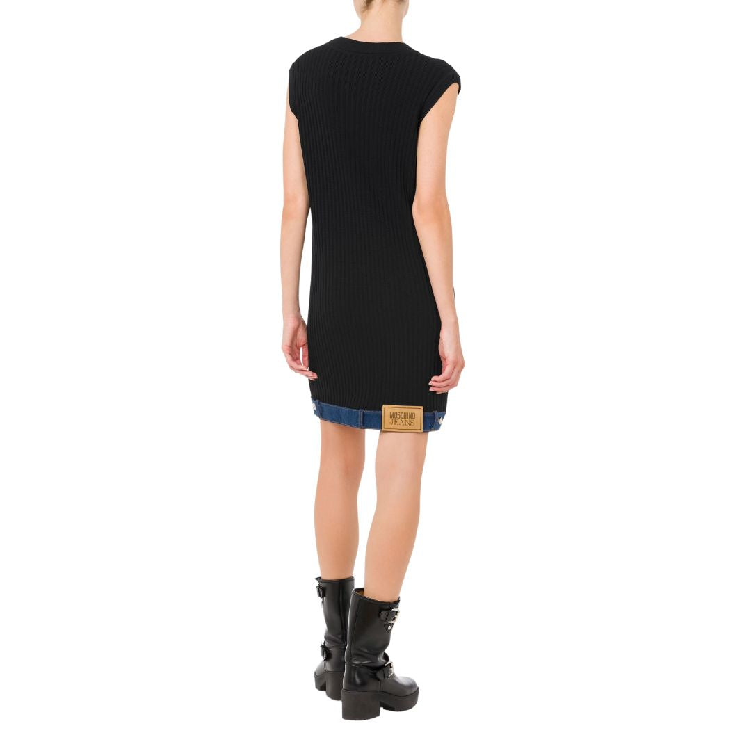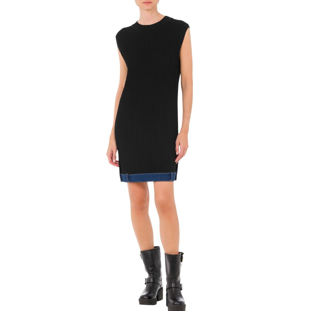 Stretch viscose crêpe dress with rib knit, denim detail on the hem and Logo Label patch on the back.