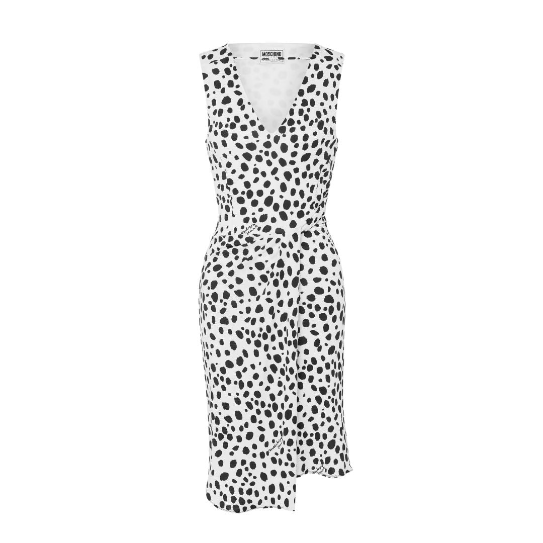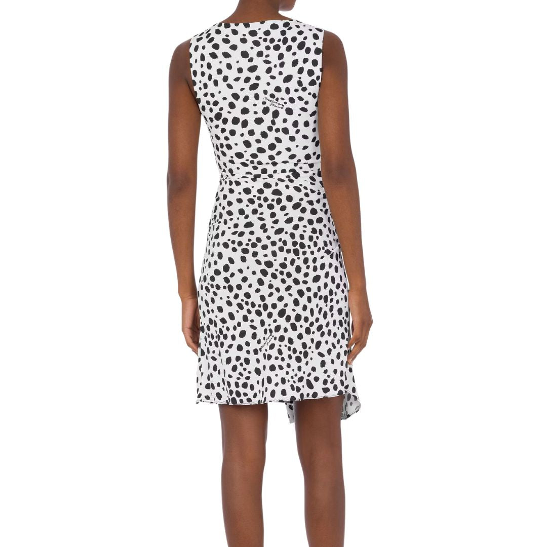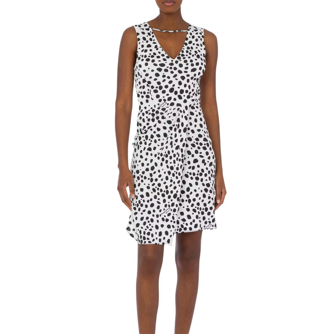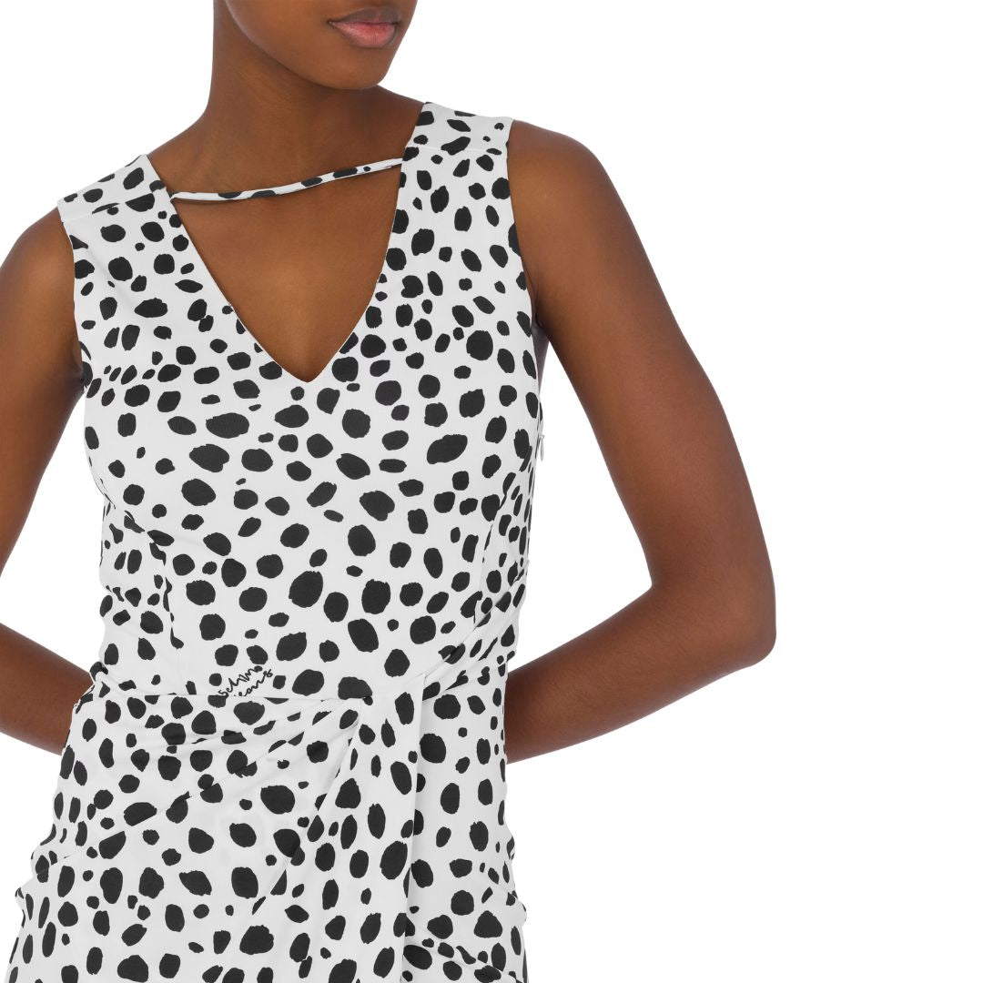 A sleek midi dress adorned with a striking leopard print and a chic asymmetric hemline. Designed to flatter with its slim fit, it showcases a sleeveless style, a graceful V-neckline, and is effortlessly fastened with a side zip closure.
