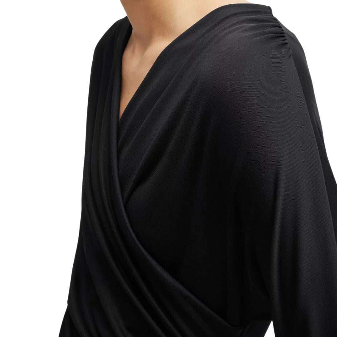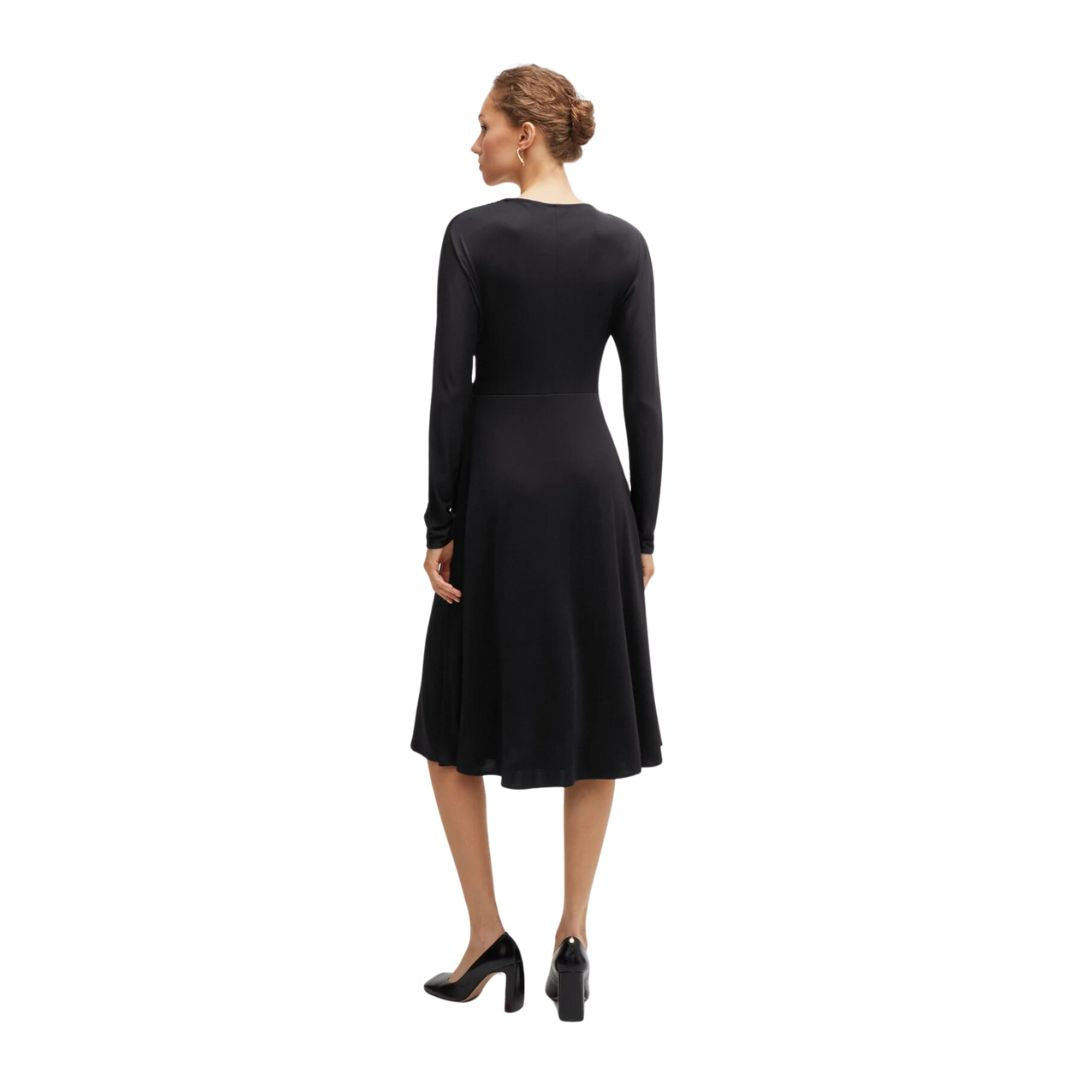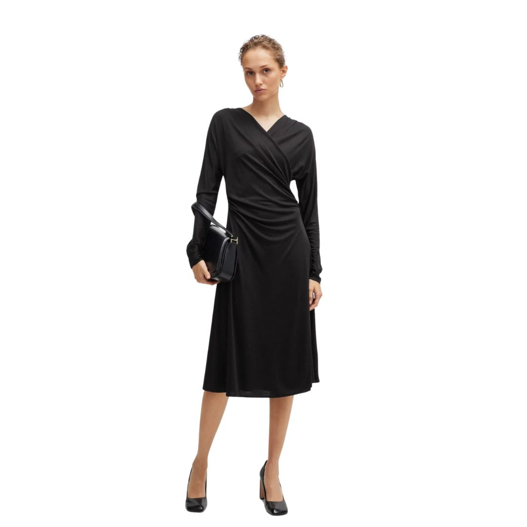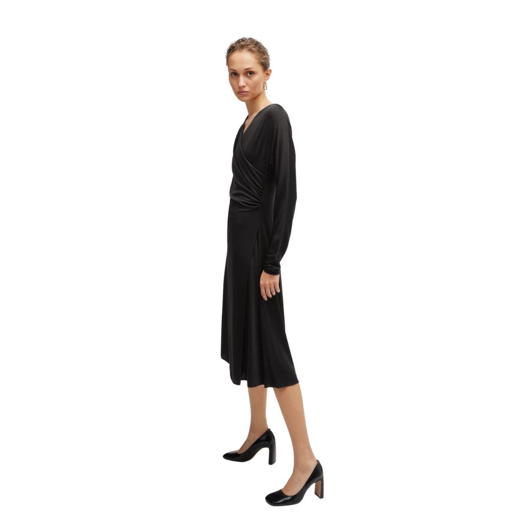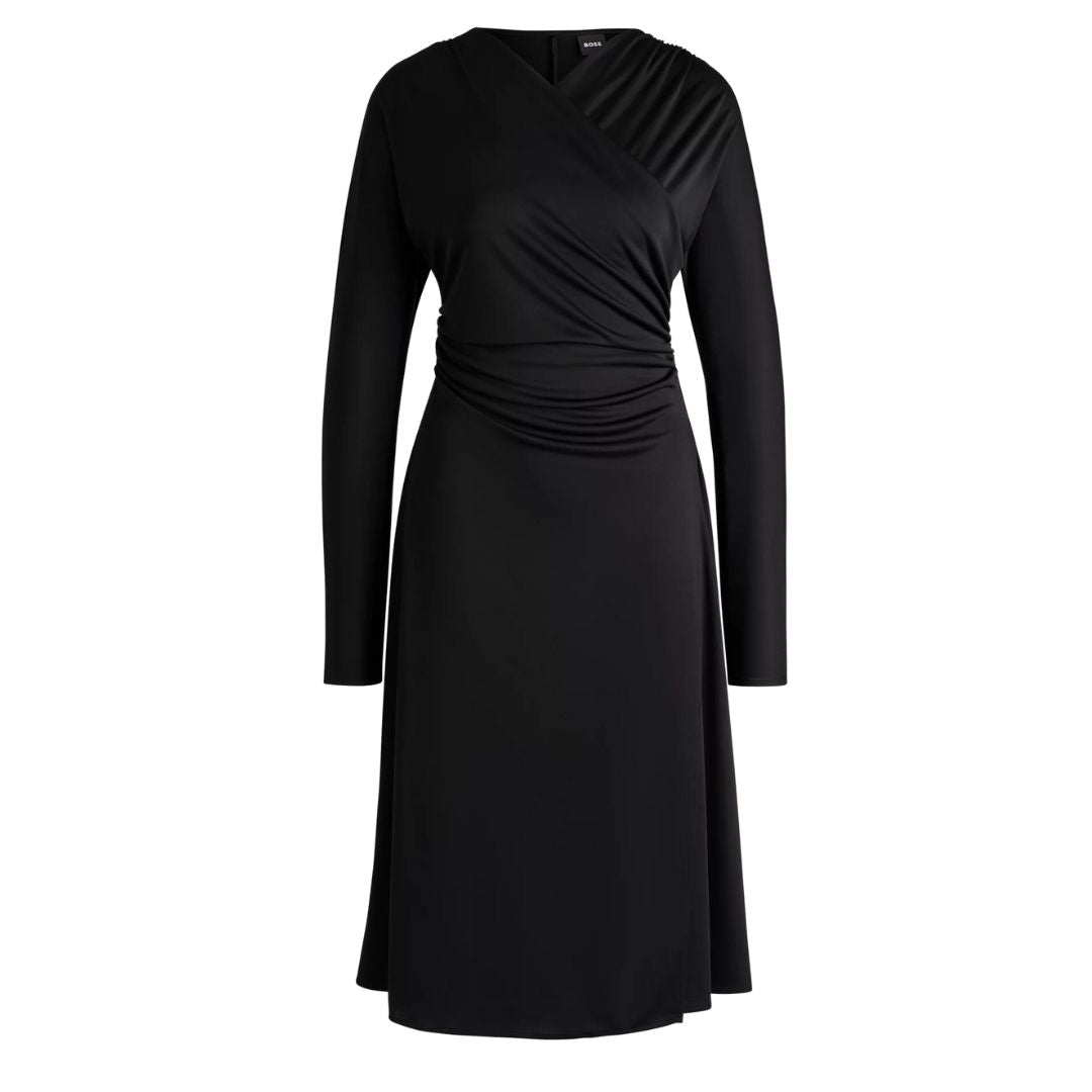 A long-sleeved dress by BOSS Womenswear. Featuring elegant gatherings at the shoulders, this contemporary dress is crafted in soft jersey for timeless comfort. This style is finished with a wrap front and slit detail.