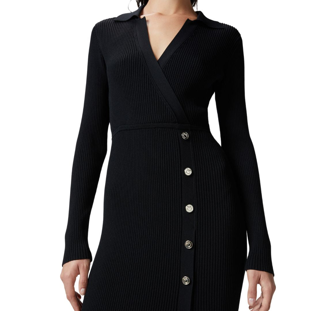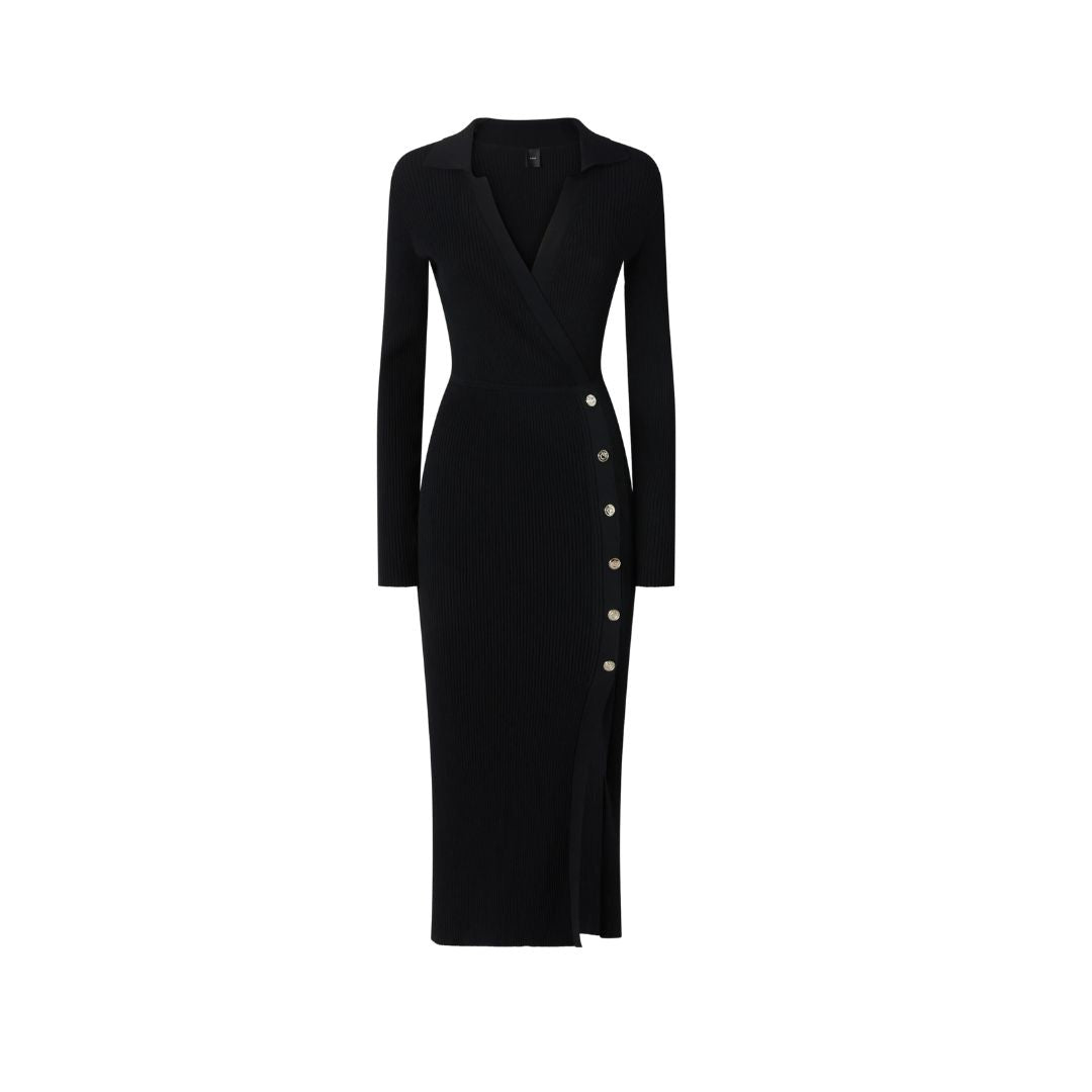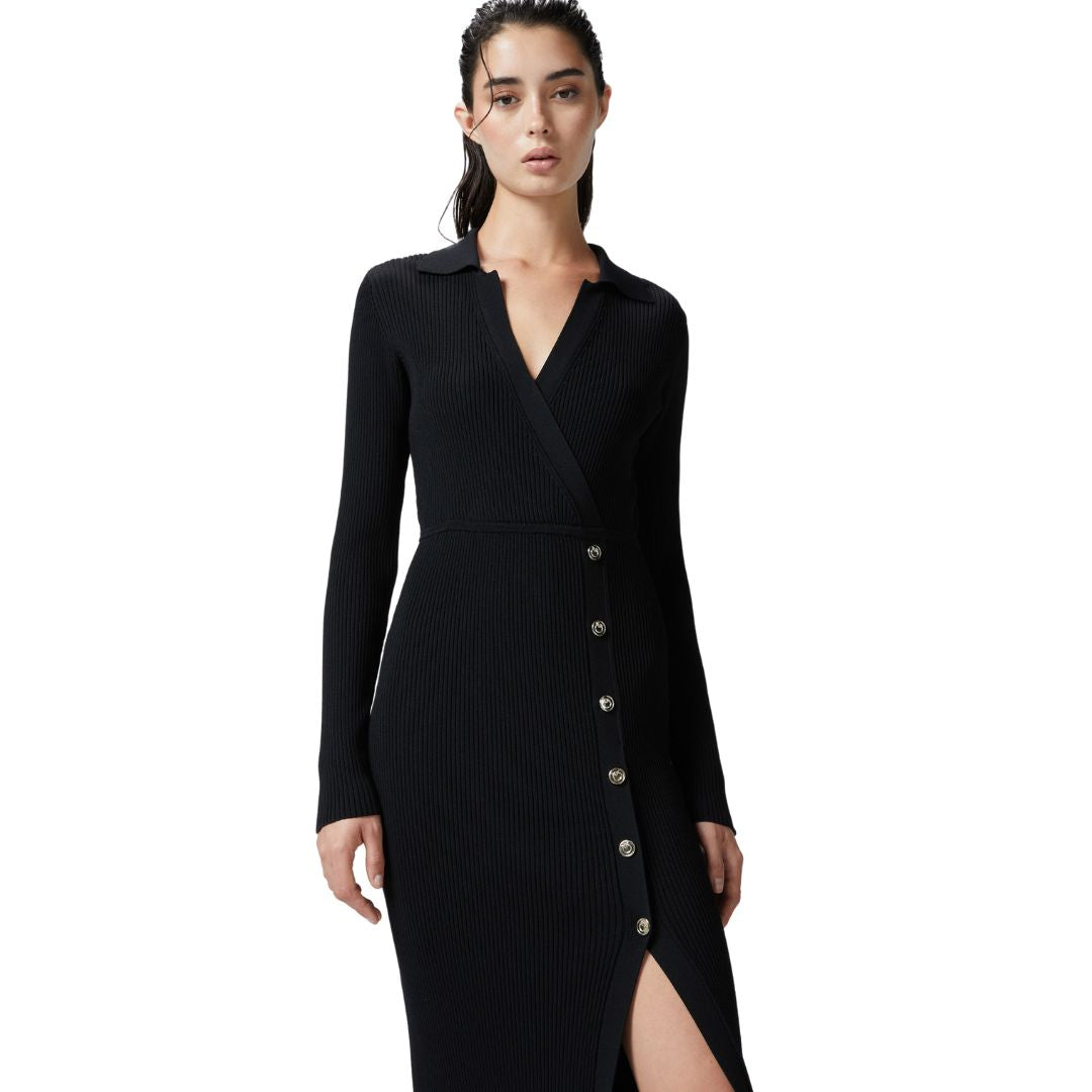 Women's long dress in stretchy, ribbed knit viscose-blend fabric. This slim-fitting dress is given an exquisite, feminine edge by the crossover V-neck at the front, shirt collar and row of golden metal buttons at the front running parallel to the deep slit at the bottom.