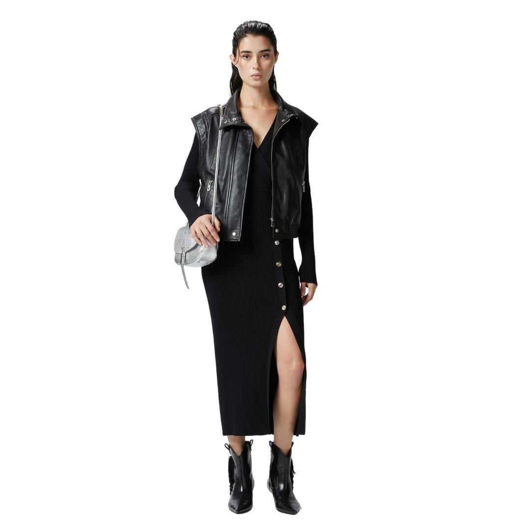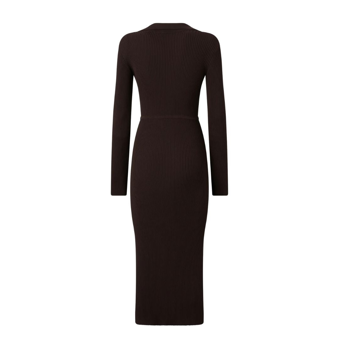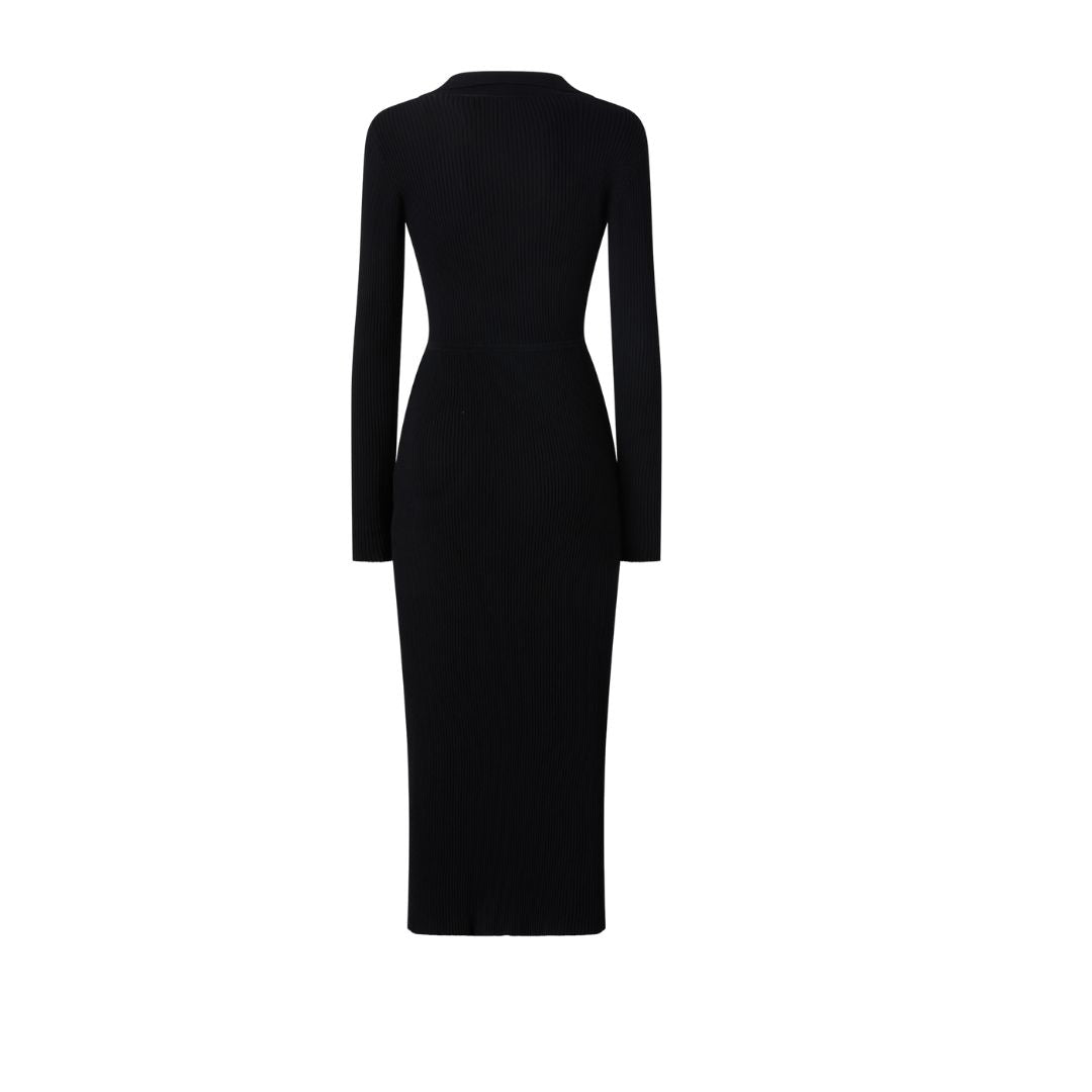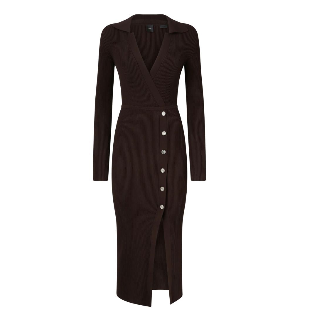 Women's long dress in stretchy, ribbed knit viscose-blend fabric. This slim-fitting dress is given an exquisite, feminine edge by the crossover V-neck at the front, shirt collar and row of golden metal buttons at the front running parallel to the deep slit at the bottom.