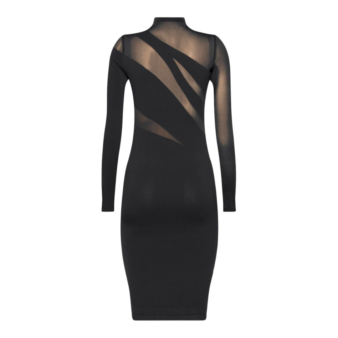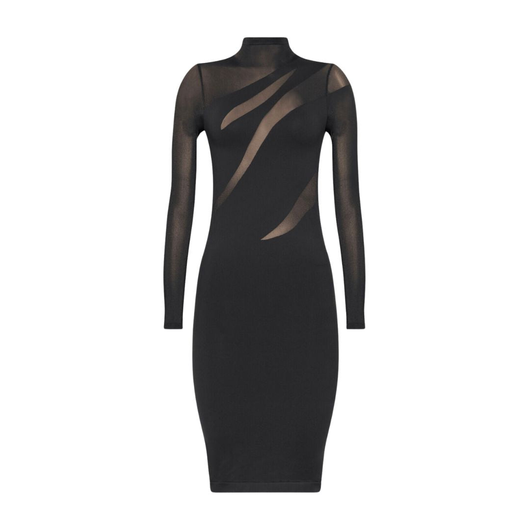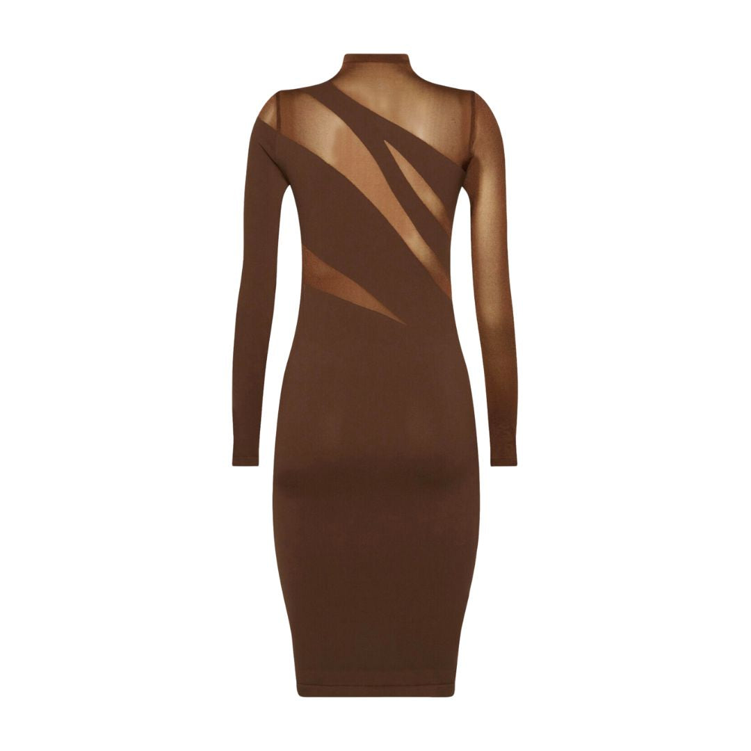 Alternating transparent and opaque panels come together to craft an alluring dress featuring an asymmetric cut-out effect. The seamlessly woven circular knit fabric is dyed sustainably, showcasing a matte finish. A sleek high neck enhances the slim-fit silhouette with long sleeves for a sophisticated look.