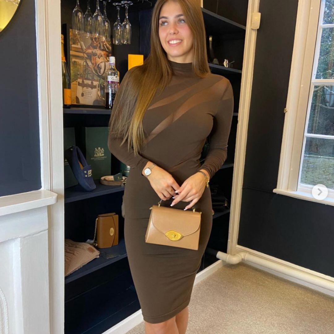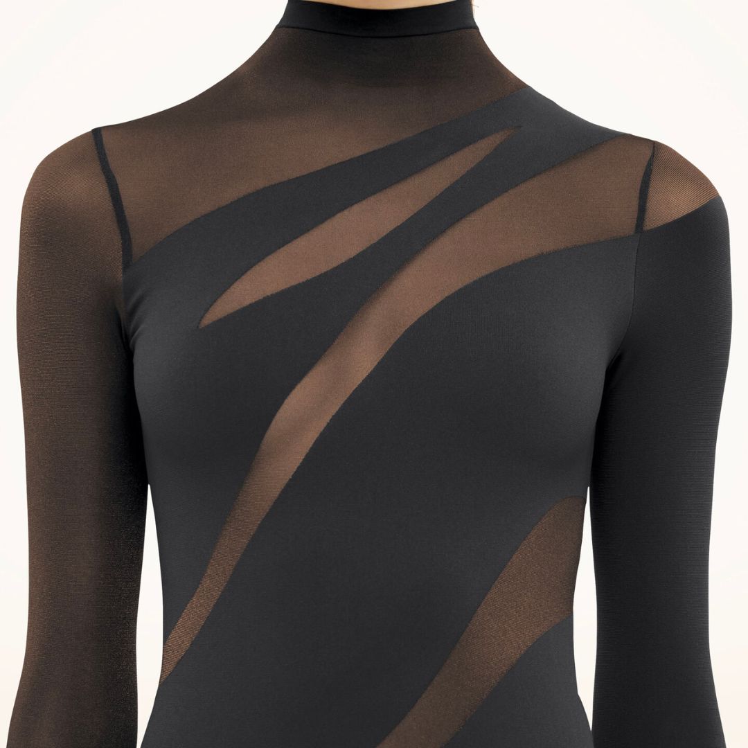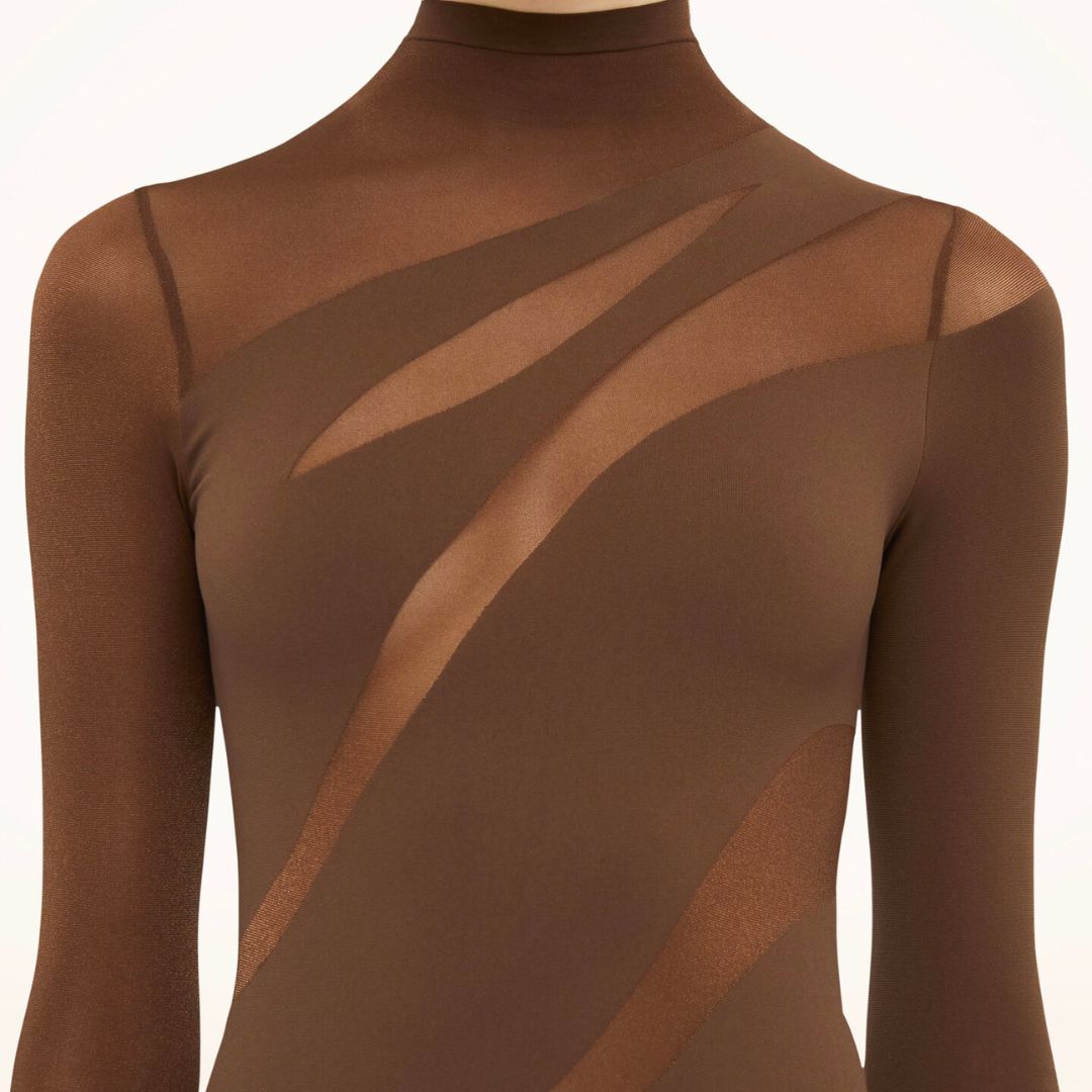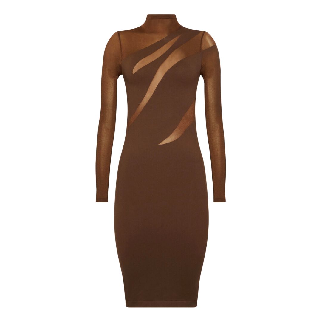 Alternating transparent and opaque panels come together to craft an alluring dress featuring an asymmetric cut-out effect. The seamlessly woven circular knit fabric is dyed sustainably, showcasing a matte finish. A sleek high neck enhances the slim-fit silhouette with long sleeves for a sophisticated look.